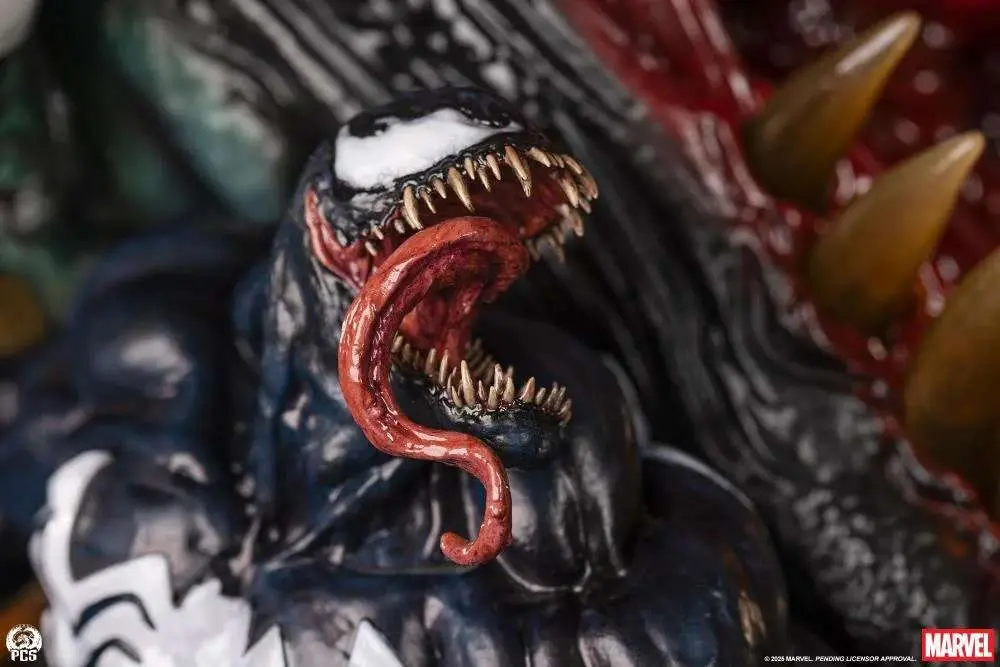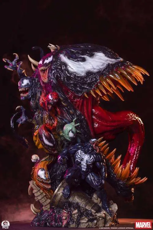 Surrounding the bust are representations of some of the more infamous symbiote hosts including Carnage, Lasher, Scream, Phage, Riot and Agony all led by Venom who stands roaring atop a massive bell, a nod to the symbiote’s weakness to powerful sonic vibrations. All of these elements are tied together by the swirling mass of claws and symbiotic material that makes up the base of the collectible. Intricate paint work and a high gloss finish add a slimy, alien texture to the symbiotic mass and bring the details of Venom’s horrifying visage to vivid life.