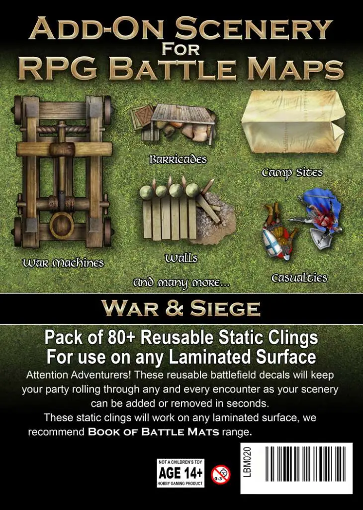 These static clings will work on any laminated RPG map to instantly add siege weapons, camps, casualties, walls and many more details!