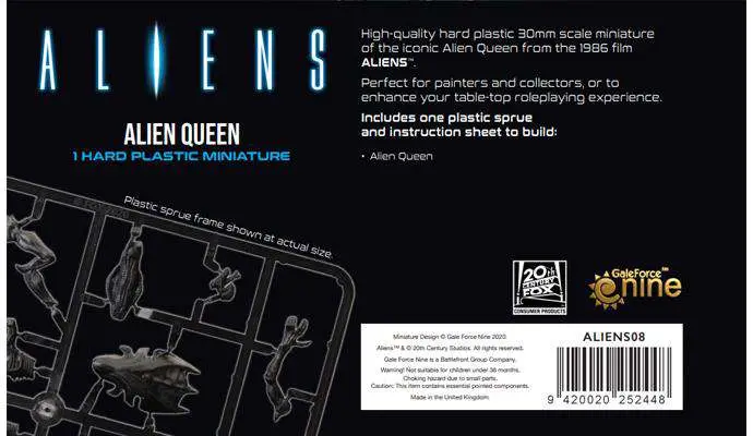 High-quality hard plastic 30mm scale miniatures, representing iconic elements from the 1986 film ALIENS™. Perfect for painters and collectors, or to enhance your table-top roleplaying experience. Perfect for painters and collectors, or to enhance your table-top roleplaying experience. Includes one plastic sprue and instruction sheet to build: Alien Queen. Some assembly and painting required - Glue and paints not included