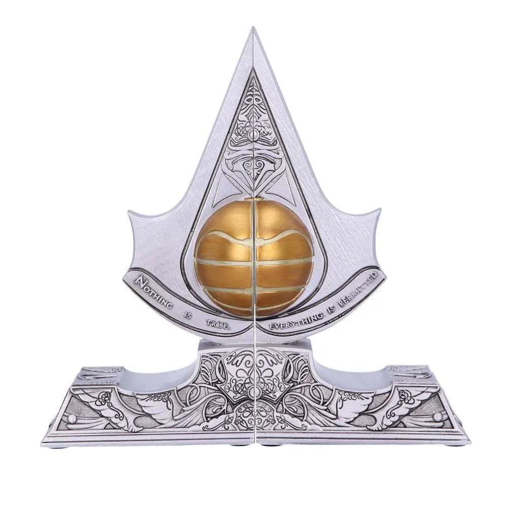 Show your commitment to the Assassin's pursuit for freedom with this Apple of Eden Bookends. The golden apple is held securely within the silver emblem of the Assassins. Engraved on the emblem is the maxim of the Assasin Order; "Nothing is true, everything is permitted". Cast in the finest resin and masterfully hand-painted, the Emblem and the Apple split into two pieces to secure the knowledge of your precious books held within.
