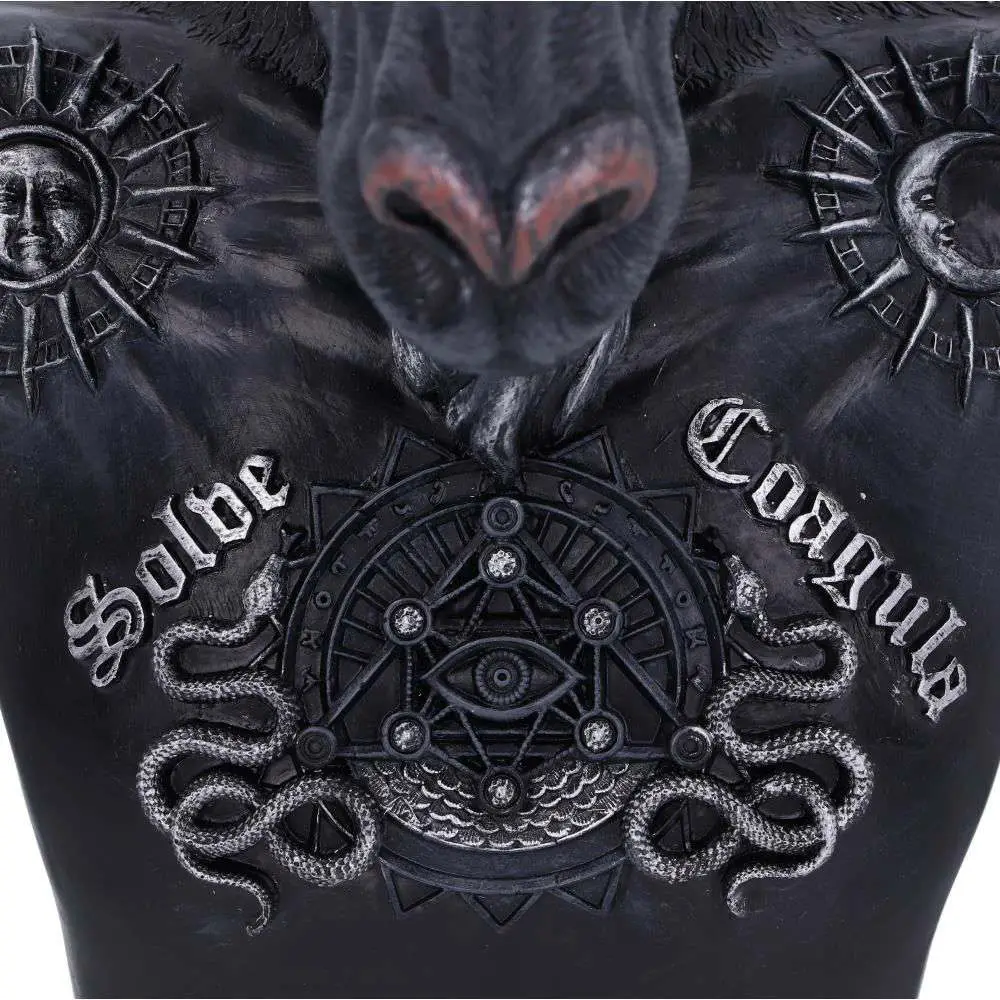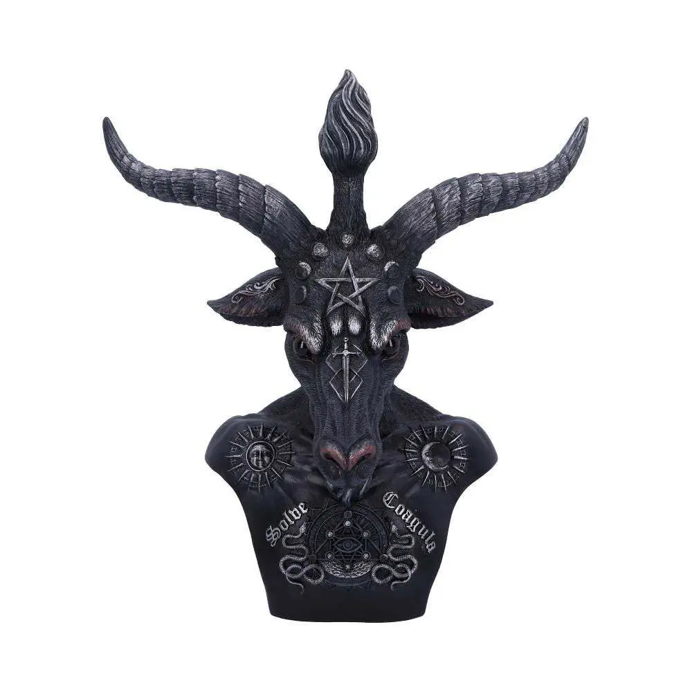 Baphomet represents the symbolisastion of the equilibrium of opposites, of free-thinking heresy and forbidden knowledge. In this bust he has a torch between its horns and a pentagram on its forehead, representing the science and the mysticism. Its chest bares the Latin words SOLVE (separate) and COAGULA (join together), on its chest are two snakes representing Male and Female, on its shoulders are the Sun and the Moon, the powers of  binding and loosing, embodying opposites and celebrating contrasts.