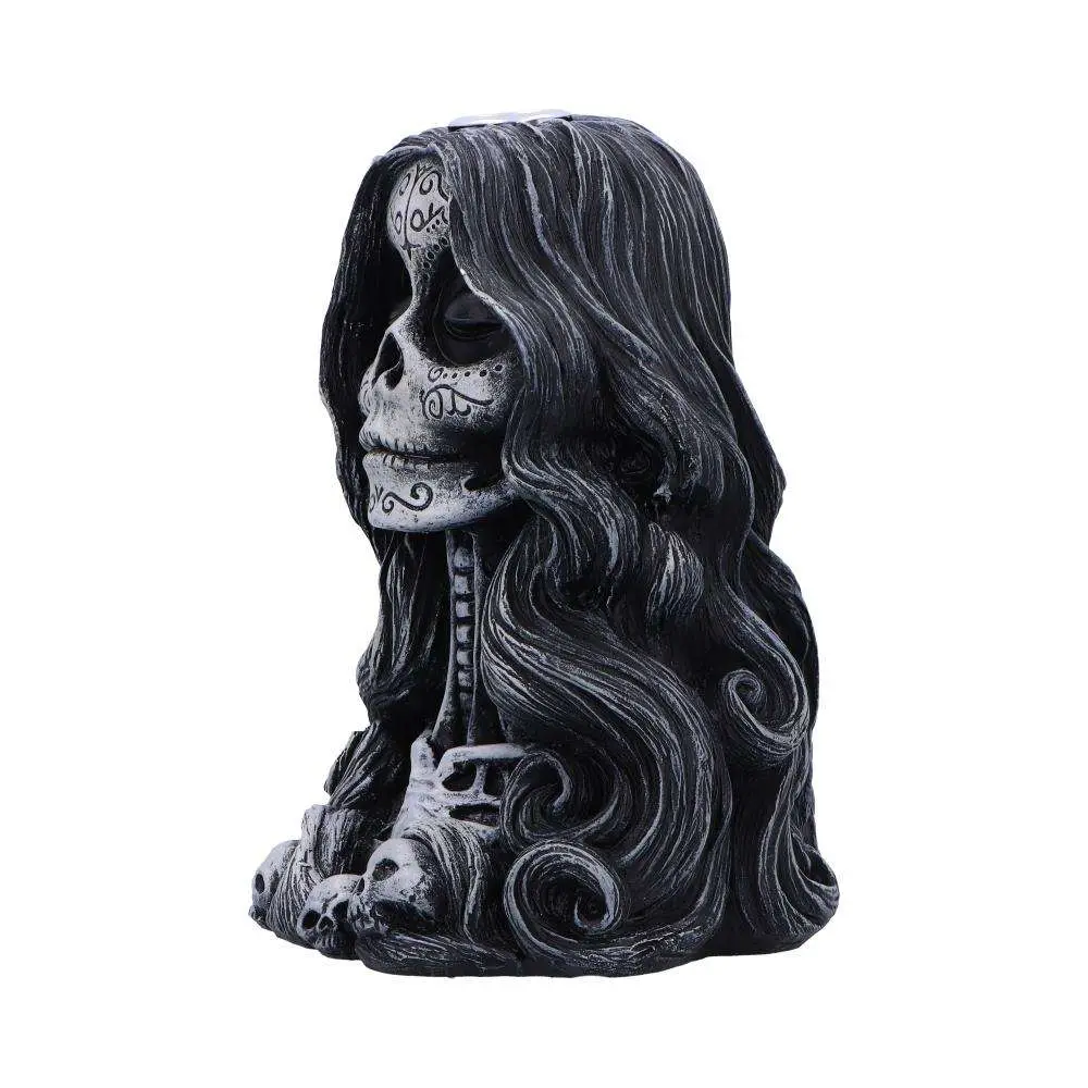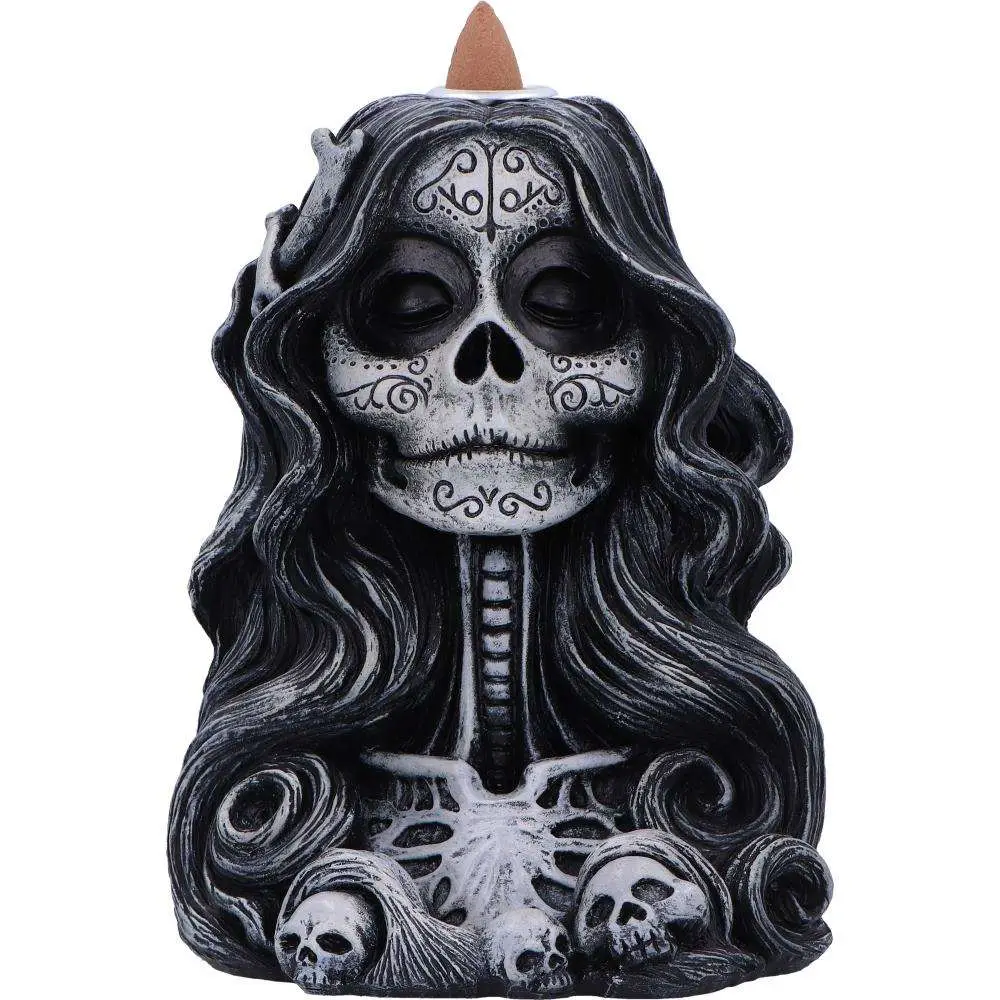 This day of the dead inspired masterpiece features a smiling skeleton, intricately decorated with flowing black hair and skulls. Designed to hold backflow incense cones, it creates a mesmerizing cascade of smoke, flowing downwards through the skull and ribs for an ethereal effect. Perfect for gothic home decor enthusiasts, this unique incense burner doubles as a stunning art piece and a functional incense holder.