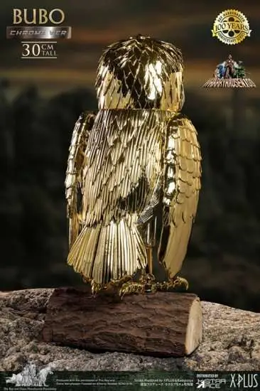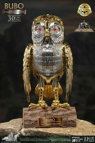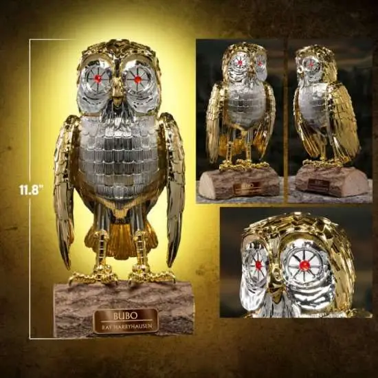 Introducing the Star Ace 30cm Soft Vinyl Chrome Bubo the Owl, a mesmerizing collectible that will delight fans and collectors alike! One of Ray Harryhausen’s most beloved creations Bubo, the mechanical owl from the movie Clash of Titans, is literally a gift from the gods. This small gold bird with ruby eyes has proved to be one of the most enduring and endearing of all the creatures Harryhausen brought to the screen.  This 30cm vinyl model of Bubo is scaled to match the actual size of the original puppet.  This new deluxe version has a simulated chrome finish to better emulate the look of the original puppet and comes with a polyresin base with a metal nameplate.