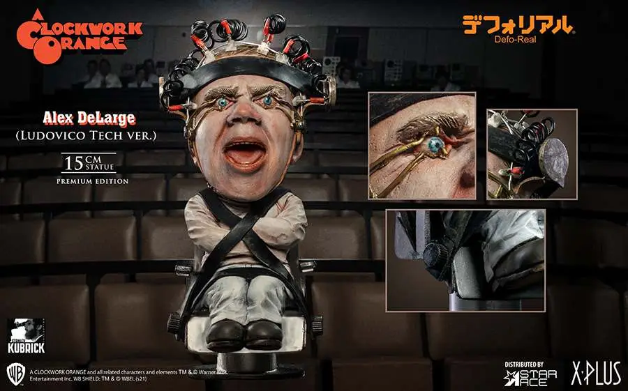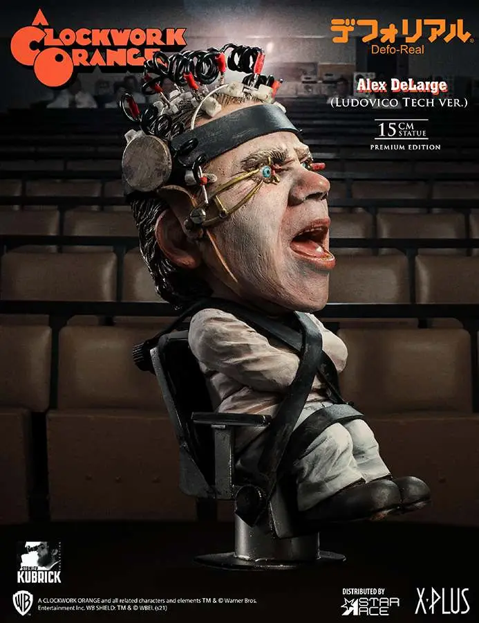 Star Ace continues its salute to the Stanley Kubrick classic, A Clockwork Orange with another Defo Real of juvenile delinquent Alex Delarge. This statue features Alex undergoing the tortuous “Ludovico Technique” to “cure” him of his violent tendencies. In this highly detailed sculpture Alex is strapped to a chair with his eyelids pinned back. He screams in agony as his beautiful Ludwig Van plays while he’s forced to watch scenes of ultra-violence. Hand sculpted by the artisans at Kaibutsuya Shop, each mini-statue is painted by skilled artisans.
