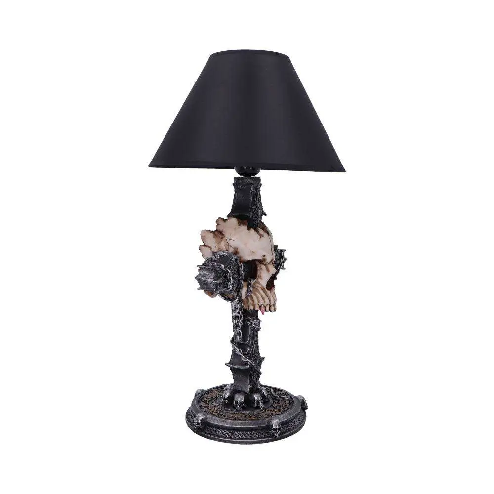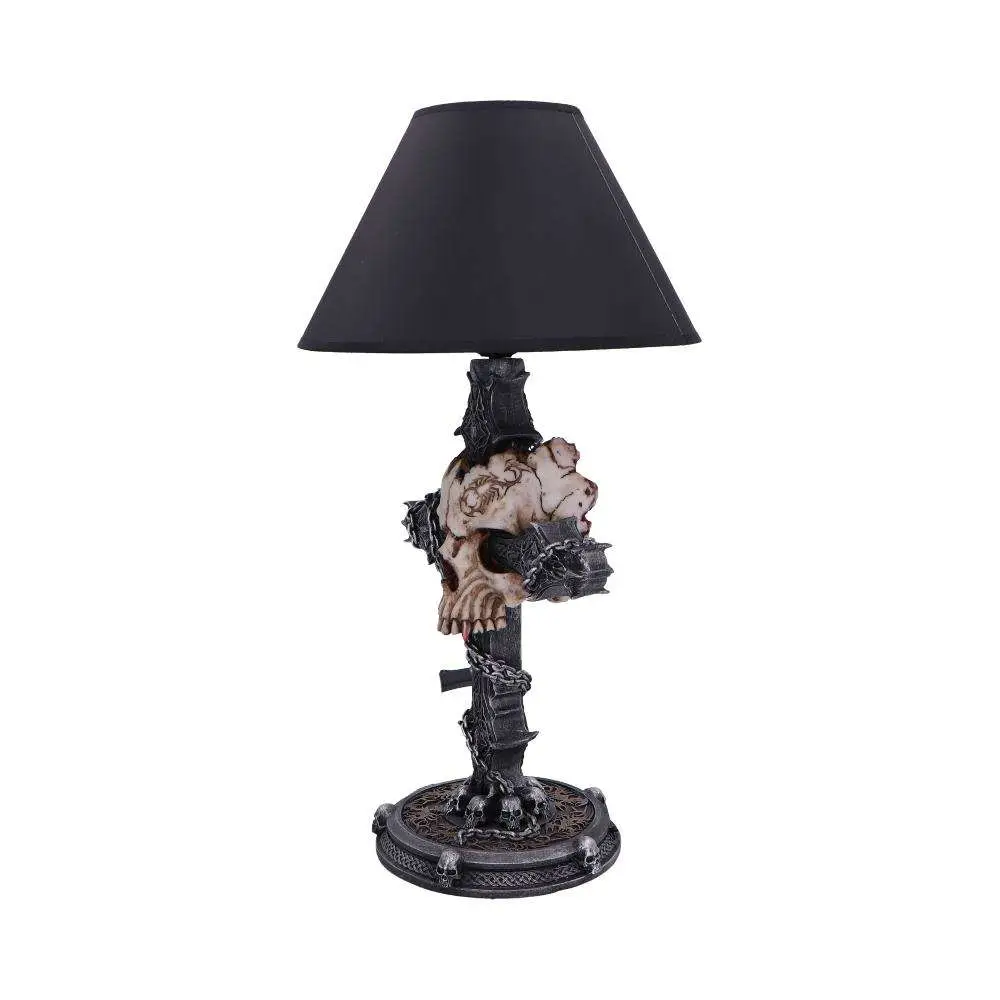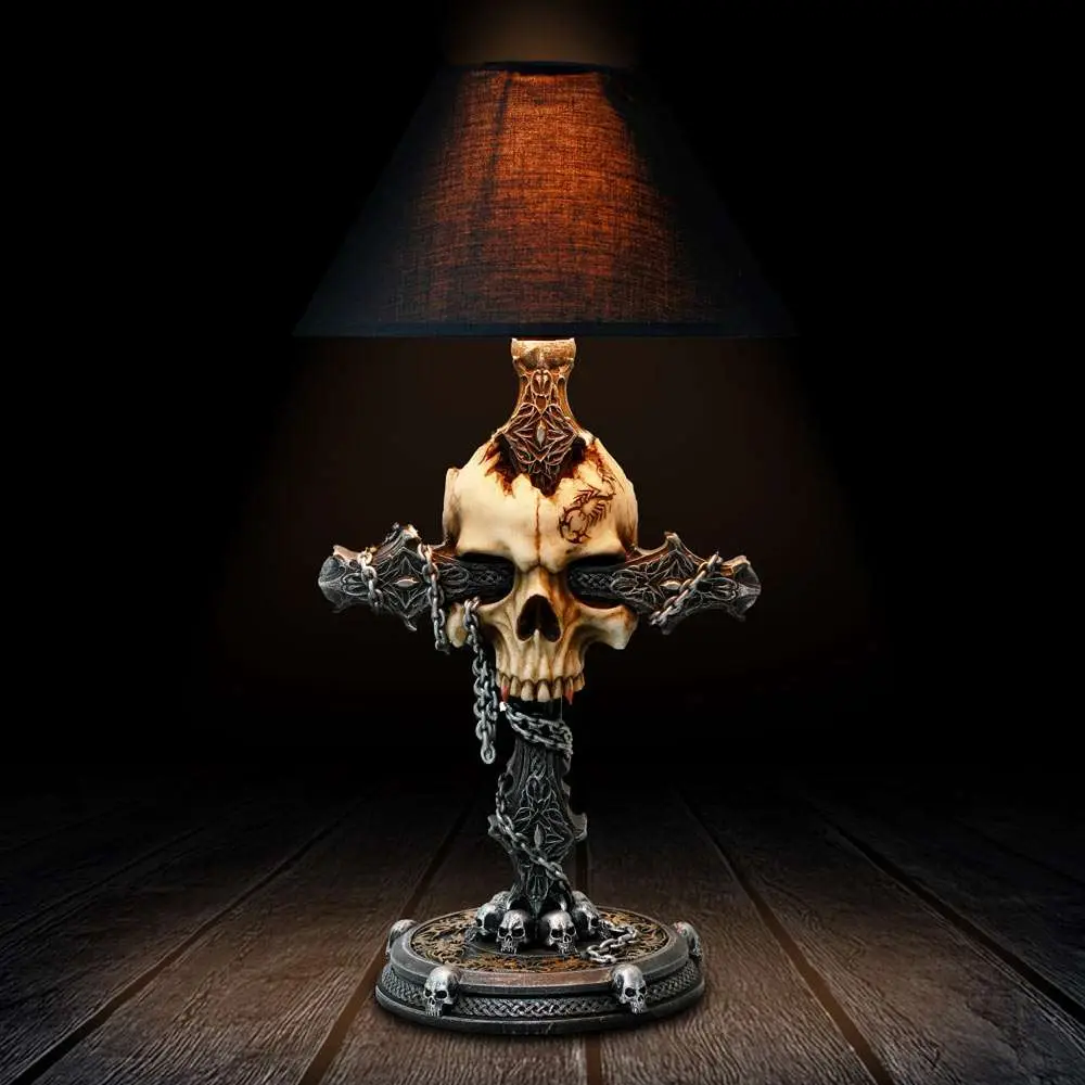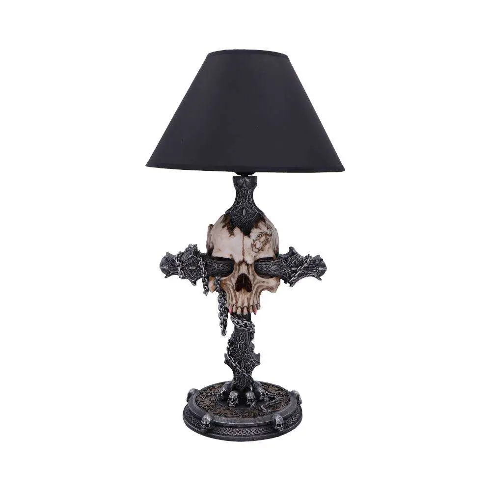 A hauntingly beautiful gothic lamp, sculpted from high-quality resin to resemble a skull pierced by a crucifix, making it a standout piece for alternative interiors.