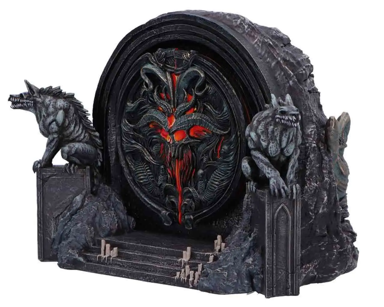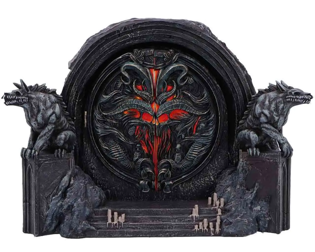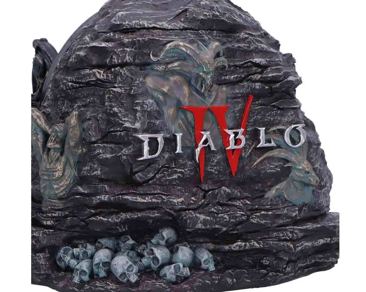Ce magnifique diorama des portes du monde souterrain de Diablo IV mesure environ 16 x 22 cm. Il est réalisé en résine et entièrement peint à la main. Les portes qui s'ouvrent révèlent un compartiment idéal pour ranger des bijoux, des dés ou de petits objets.