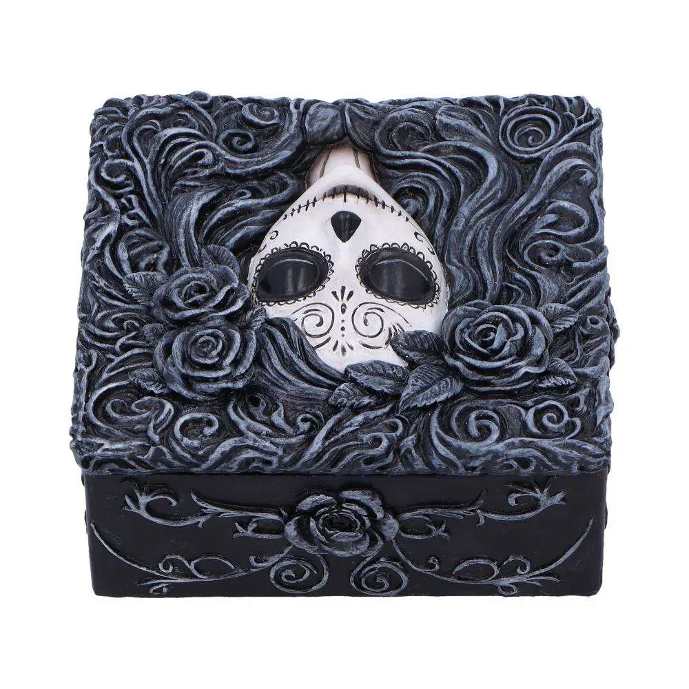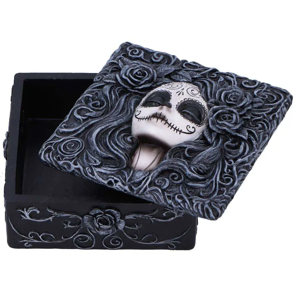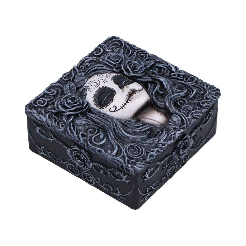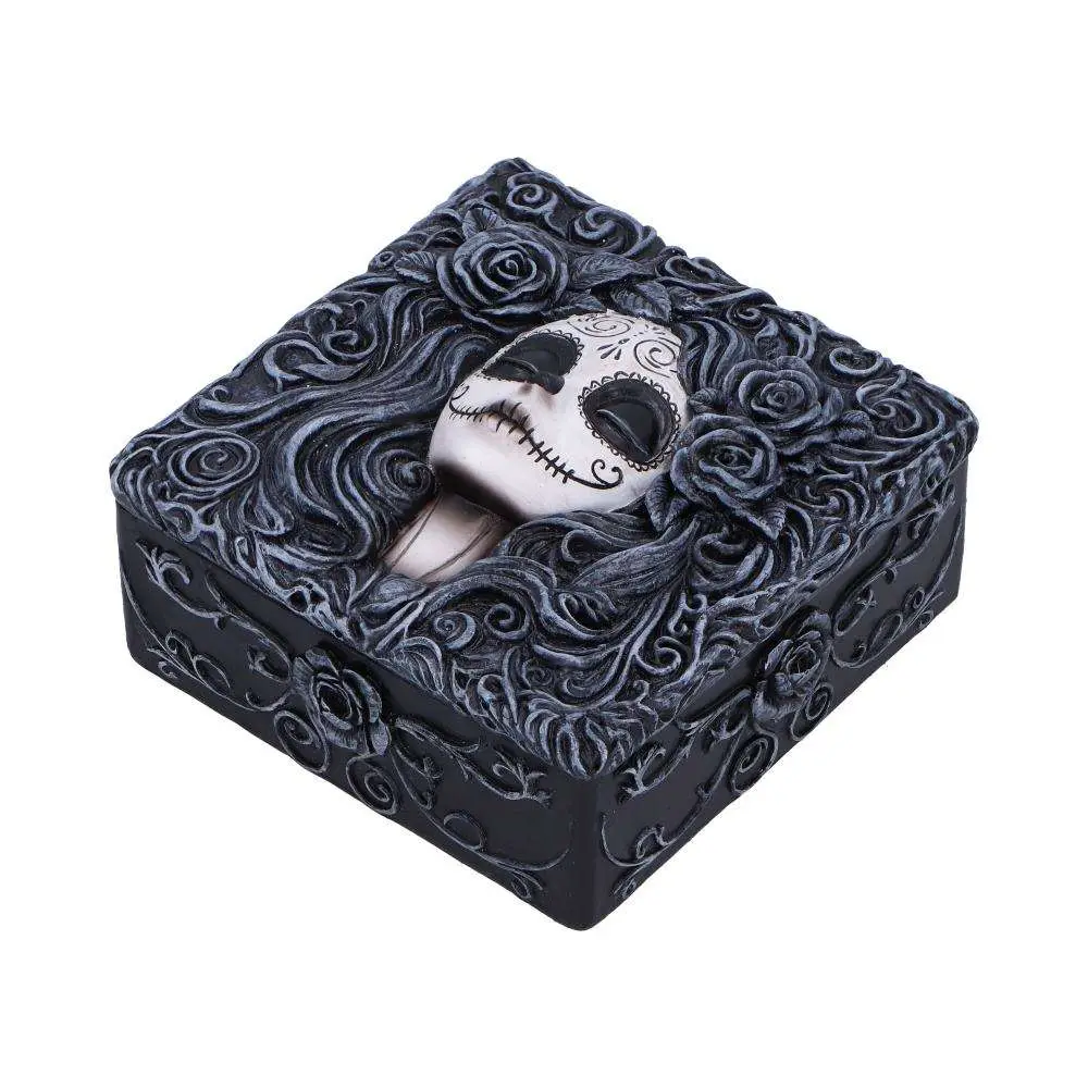 A compact 6.3cm trinket box inspired by the Day of the Dead, with a gothic twist for storing small keepsakes and treasures.