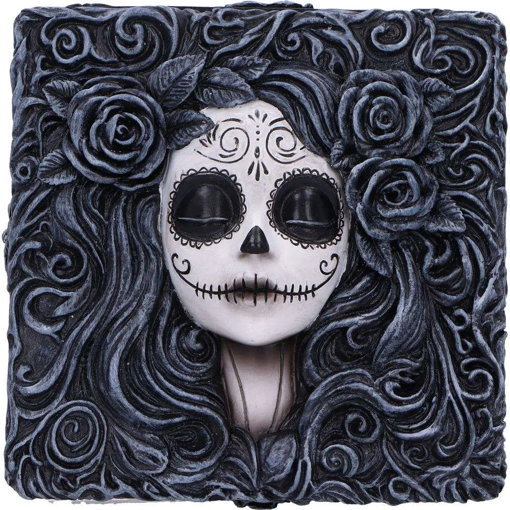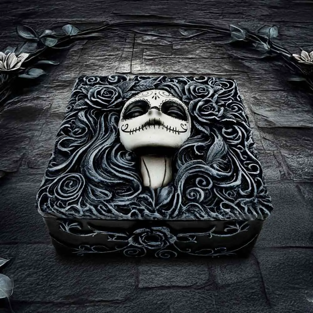 Gothic decor fans, collectors of Day of the Dead art, and customers looking for unique storage or alternative gifts.