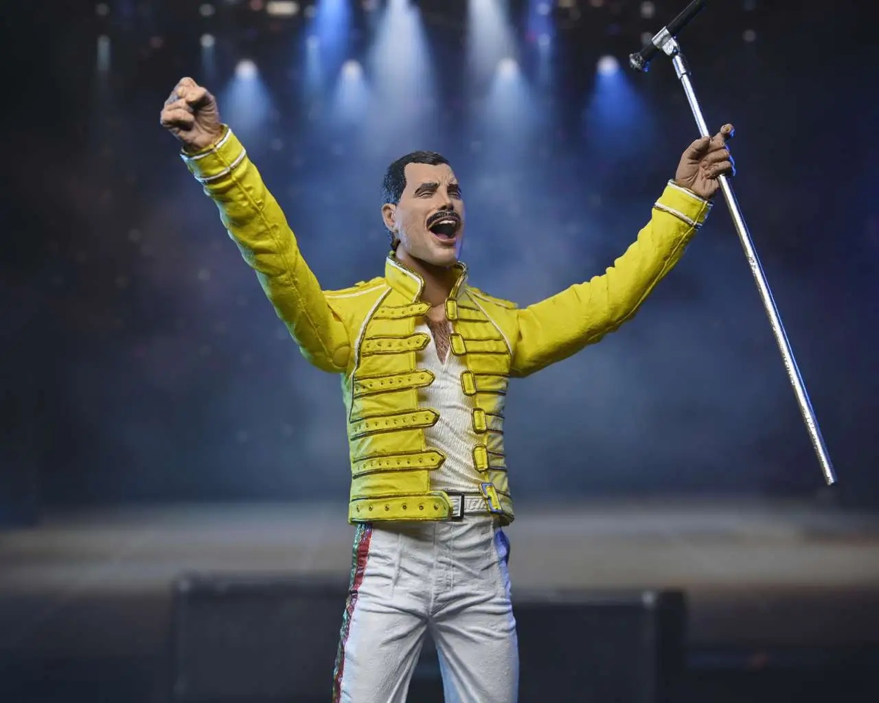 Celebrate Freddie Mercury, one of the most distinctive and powerful voices in rock music, with this 7” scale action figure! The legendary Queen vocalist wears his iconic yellow jacket from 1986's “Magic” tour, which closed with a show in front of 120,000 fans that would be Mercury’s final performance. The figure has a ball-jointed neck and articulated shoulders and includes microphone, mic handle, alternate interchangeable head and display base. Window Box Packaging.