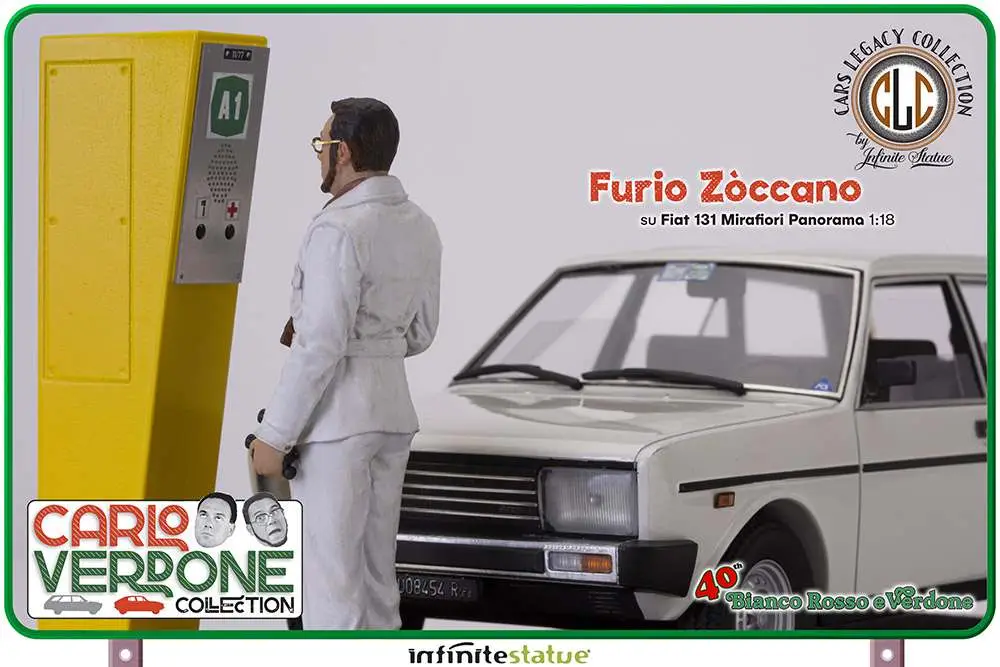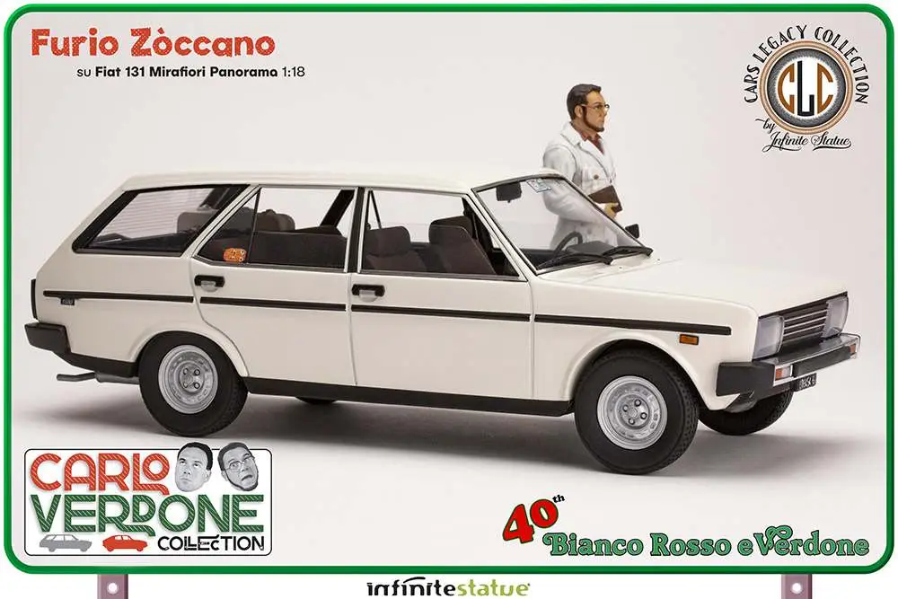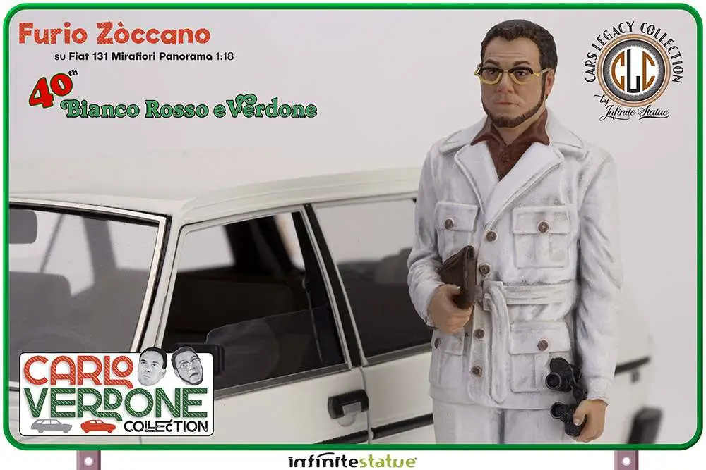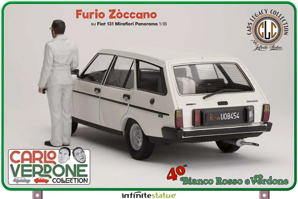 As in the previous pieces, by means of a maniacal quest for details, studying the frames of the film and benefiting from Verdone’s infallible memory, we have been able to create, perfect in every aspect, the cherished Fiat 131 Mirafiori Panorama that Furio treated better than his wife! From the suitcases in the boot to the ACI motoring club sticker on the windscreen, everything is in its right place. And of course, there is Furio Zòccano himself, standing, ready to set out, armed with the car’s documents and a pair of binoculars, towards the celebrated SOS totem. A 1:18 scale model that will once again leave everybody speechless.