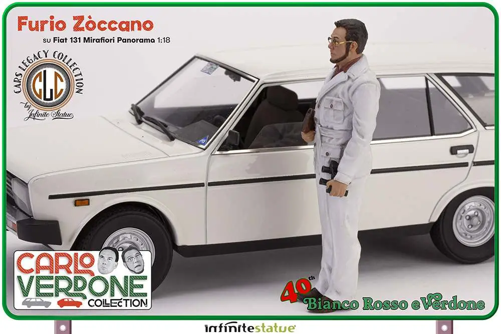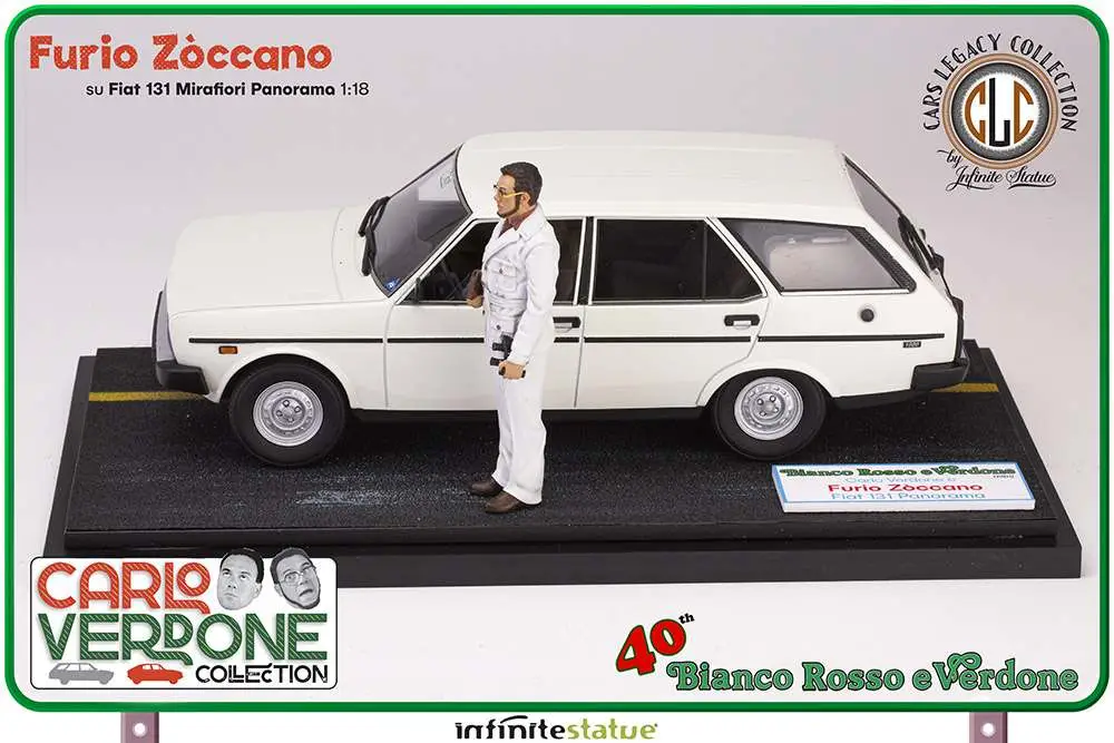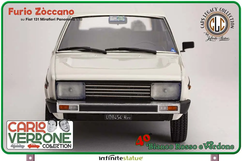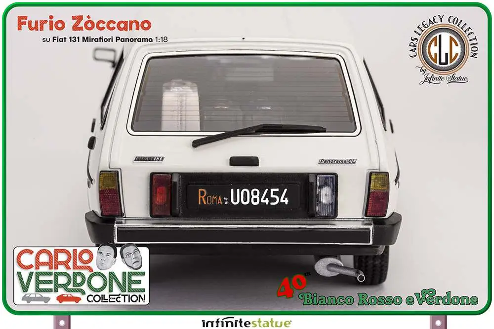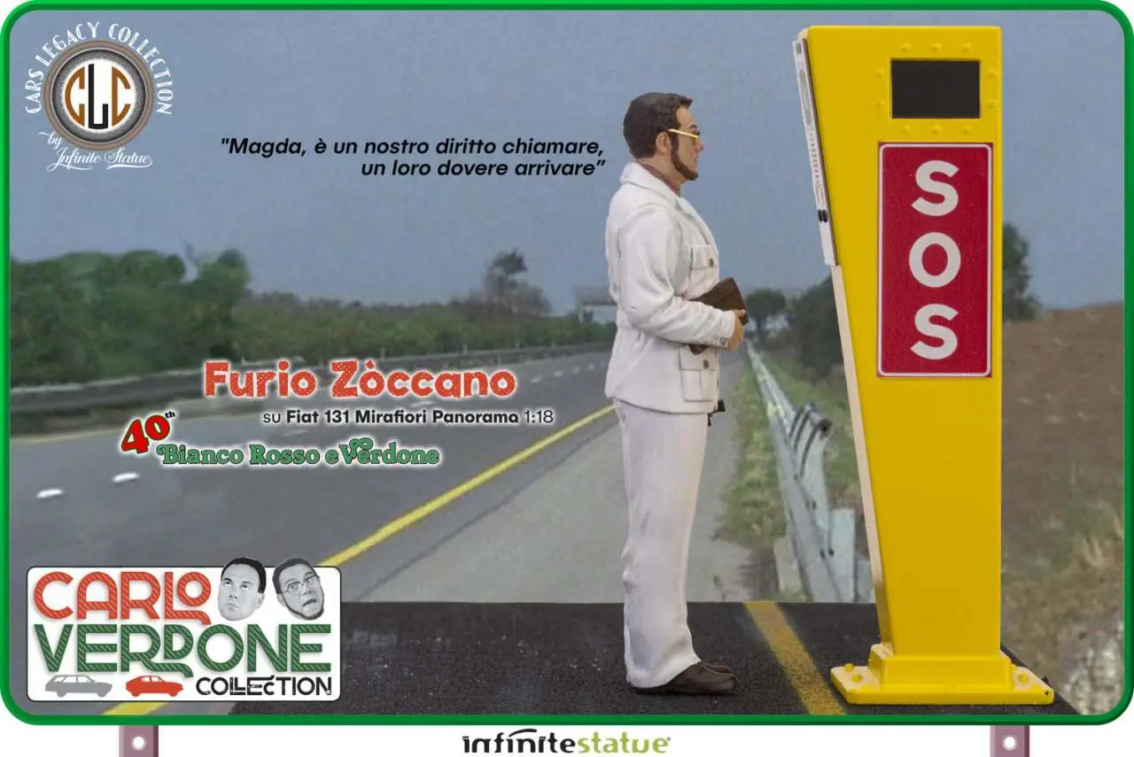 As in the previous pieces, by means of a maniacal quest for details, studying the frames of the film and benefiting from Verdone’s infallible memory, we have been able to create, perfect in every aspect, the cherished Fiat 131 Mirafiori Panorama that Furio treated better than his wife! From the suitcases in the boot to the ACI motoring club sticker on the windscreen, everything is in its right place. And of course, there is Furio Zòccano himself, standing, ready to set out, armed with the car’s documents and a pair of binoculars, towards the celebrated SOS totem. A 1:18 scale model that will once again leave everybody speechless.