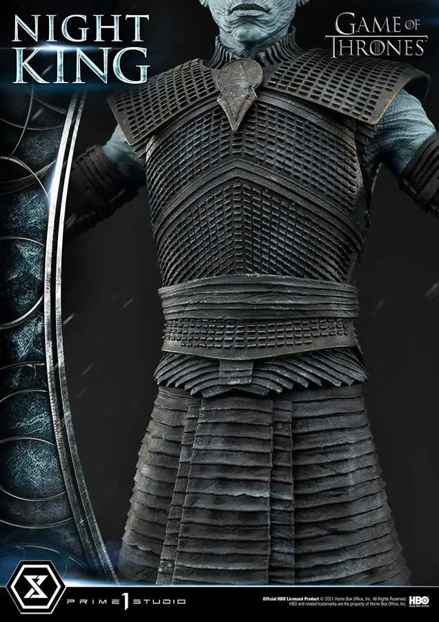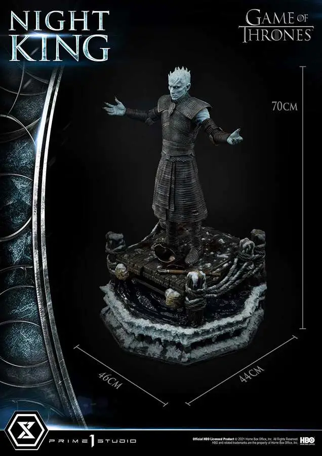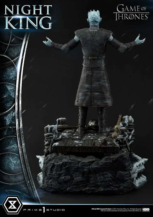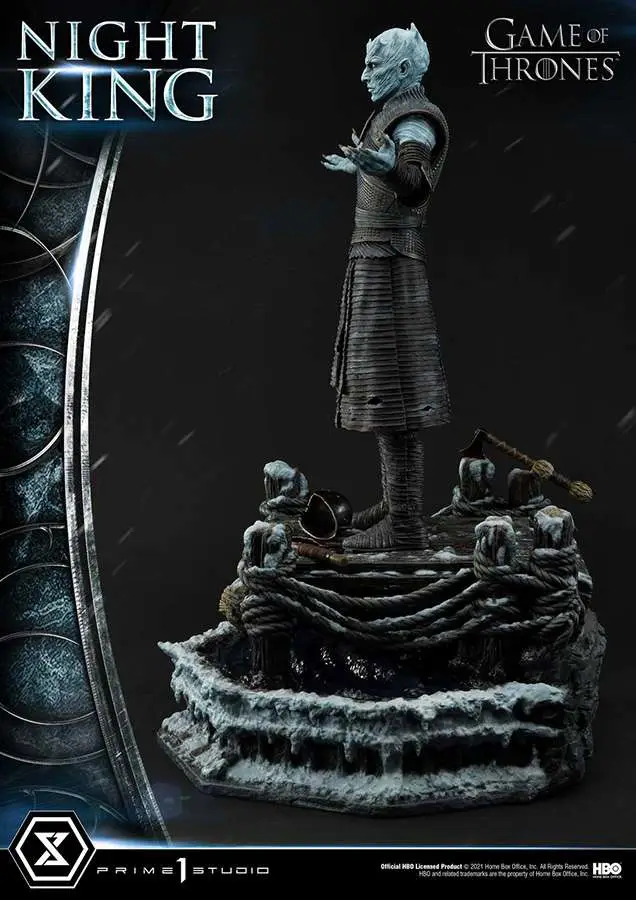And now, our talented sculptors and painters bring to you, that pivotal scene. Standing at over 27 inches on an icy, ramshackle dock, the Night King postures in all his chilling splendor. We have taken care to carve all the intricate details of his wrinkled façade, his ominous stare and his decrepit, battle-worn armor. We have rendered a faint dusting of snowfall on choice locations all over the Night King’s form to call to mind the frigid Hardhome conditions brought about by his mere presence.