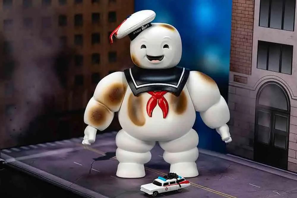Le diorama est à l’échelle 1:64 et contient l’emblématique Ecto-1 et Mr. Stay Puft en métal moulé sous pression.