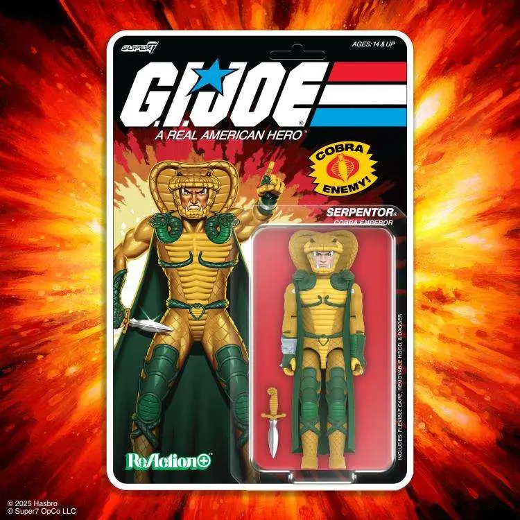 Inspired by the animated series G.I. Joe: A Real American Hero, the new G.I. Joe ReAction+ Figure of Serpentor features cartoon-accurate sculpt details and a soft goods cape, includes a dagger accessory, and comes packaged on a blistered cardback. Designed to capture the look and feel of the vintage G.I. Joe toy line from the early ‘80s, this throwback figure also boasts O-Ring construction with 12 points of articulation for ultimate posability.