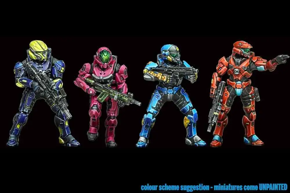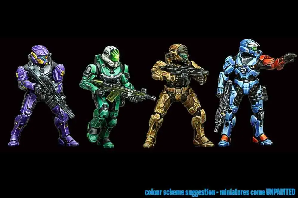 8x modèles de Spartan ; livret de règles en anglais ; tapis de jeu ; éléments scéniques et pions en carton pré-colorés ; 10x cartes d'armes ; 8x cartes de joueurs/modèles ; 2x cartes de référence ; 12x dés D8 ; 6x dés de commandement