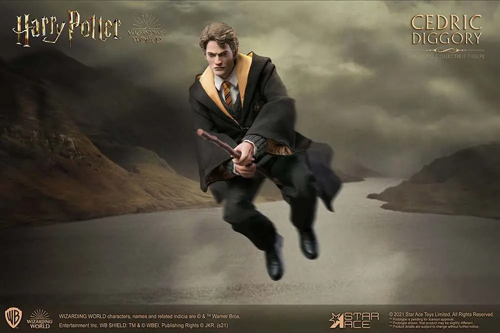 This 1/6 scale articulated figure of Cedric Diggory features an authentic likeness of Robert Pattinson as the character outfitted in his Triwizard competition outfit from the final challenge. Accessories include his wand, a flying broom, and the Triwizard cup.