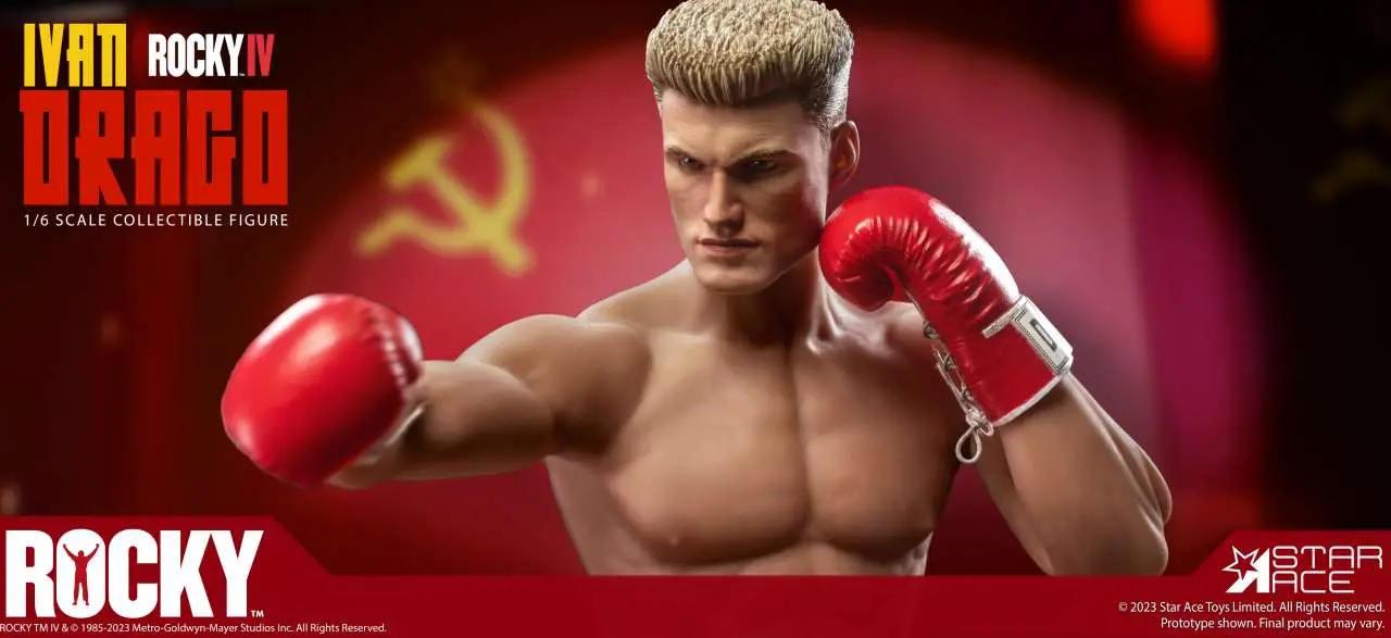 The regular version of this one sixth figure of Ivan Drago stands 32 cm tall and features a head sculpt with an authentic likeness to Drago. He comes with interchangeable hands and boxing gloves, his red jacket, red boots and boxing shorts.