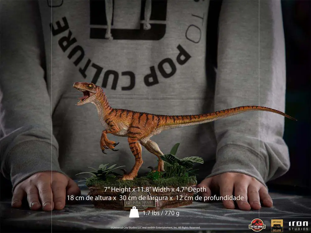 With an orange coloring similar to a tiger with dark stripes and yellow piercing eyes, he is the first male variant of his species, never-seen-before in the cloned animals. Hunting in packs and highly intelligent, the voracious carnivorous creature with a primitive level of vocalization communicates with other members of his herd, both for directing coordinated hunting attacks and for setting traps for their prey. On a pedestal with the movie’s The Lost World: Jurassic Park logo, Iron Studios present a statue of the Velociraptor, one of the most lethal and feared dinosaurs from Isla Sorna.