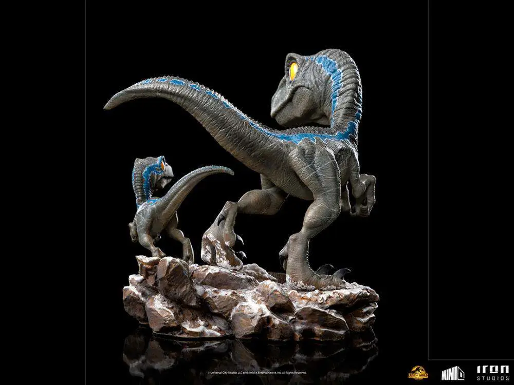 Running and hunting together, the Velociraptor mother and her baby, a smaller version that looks just like her, continue to discover a new world. As if they were smiling for each other, over a pedestal of rocks covered by snow with the movie’s logo in the front, Iron Studios present the MiniCo figures of Blue and Beta, with the most beloved dinosaur from Jurassic World and her baby as presented in the trailer of the movie that completes the trilogy.