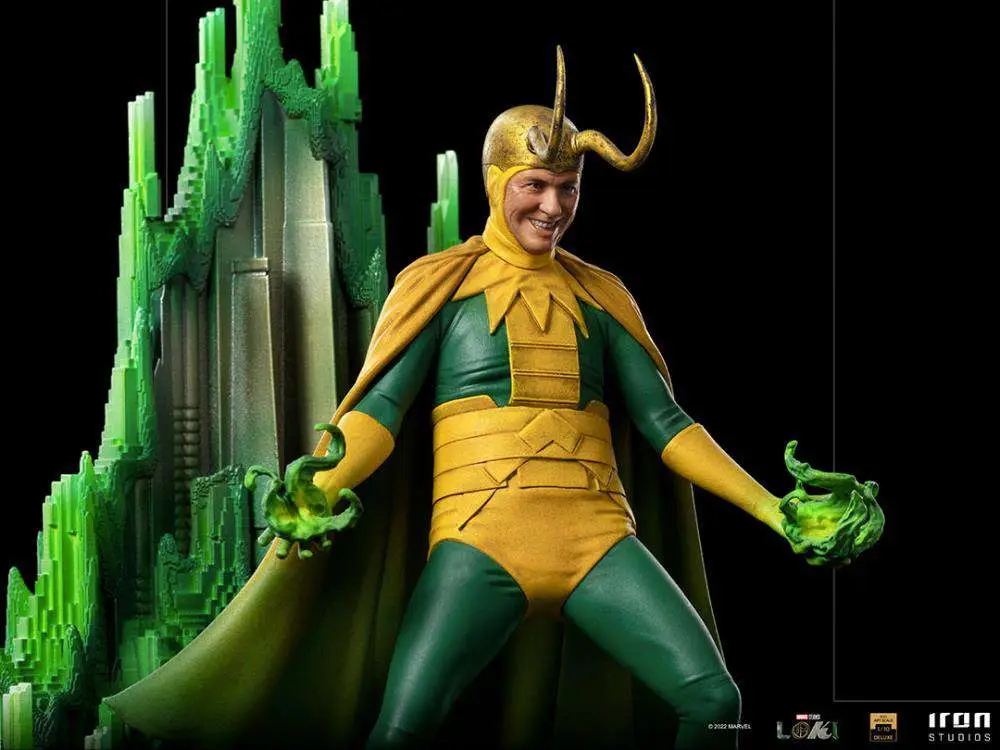 As the Asgardian sorcerer master, his magic deeds are seen by others as nearly impossible, and at the height of his abilities, with pure mystic energy hatching from the palms of his hands, the experient God of Mischief’s figure with green and yellow leotard suit, yellow cape, and golden helmet with horns, uses his power to the fullest on a pedestal on which he creates an illusion of the Asgard palaces as a trick to call the attention and deceive the trans-temporal entity guardian of the Void named Alioth. With an audacious smile on their face, Iron Studios bring the statue of Classic Loki, Thor’s fearless adoptive brother, inspired by his classic version in the comics, presented in the Loki series from the streaming service Disney+.