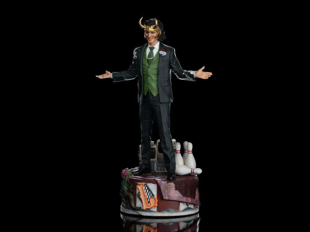 In a place out of time and space, in the underground hideout where alternate versions of the God of Mischief coexist, one of them, in the position of a leader, expresses his plan of completely taking control, surrounded by his followers. Arrogant and narcissist, he displays on his head a smaller version of his helmet with horns and dresses a formal suit with waistcoat and tie in shades of green, yet a bit ragged and worn out, but still aligned to the job that he wishes to conquer. Without “losing the hand” of their future releases, Iron Studios presents the statue “Loki President Variant - Loki - Art Scale 1/10", with the elected commander of the army of Loki’s variants.