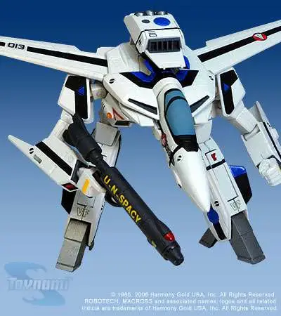 Introducing Toynami’s newest innovation: the Macross 1/100 Scale Transformable! Each fully transformable action figure stands approximately 6 inches tall and is fully articulated! Fully transformable into three modes: Fighter, Guardian and Battloid. Includes gunpod weapon accessory and adjustable display stand.