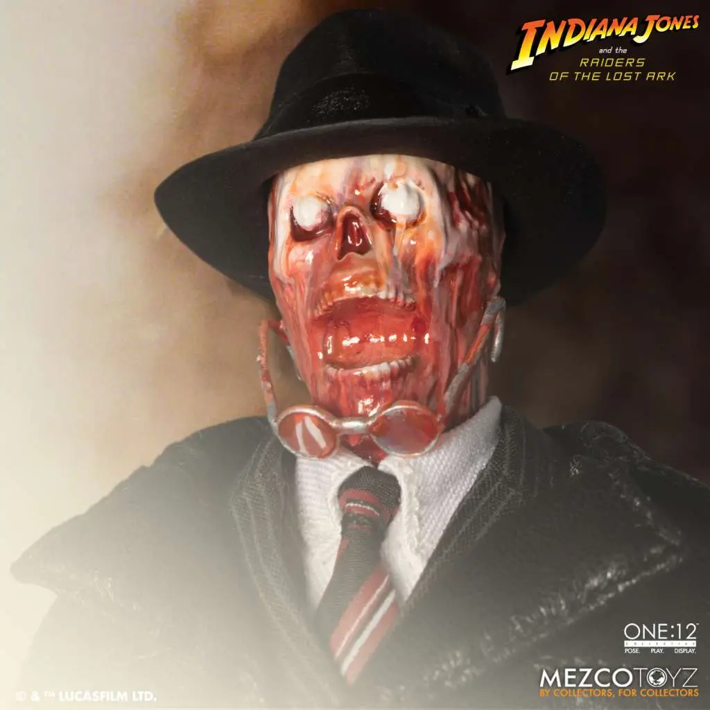 The sinister Major Toht is dressed to the nines as he aids the Nazis in their search for the legendary Ark of the Covenant, wearing a pinstripe 3-piece suit and overcoat, gloves, and a fedora. He comes complete with 4 head portraits in transitional stages as his skin melts off his skull.