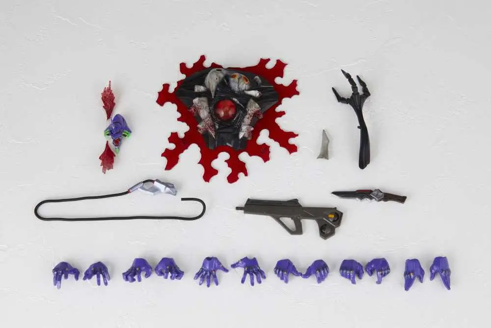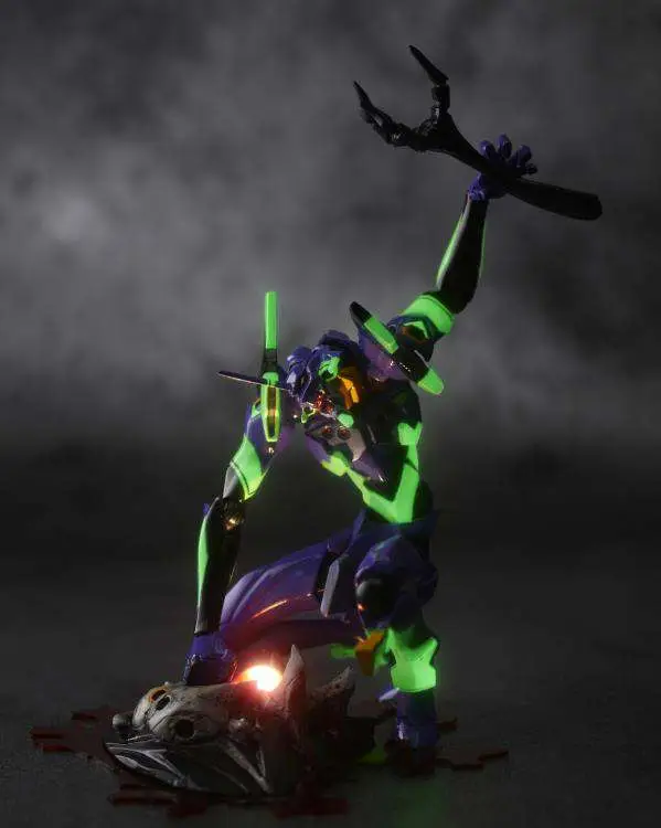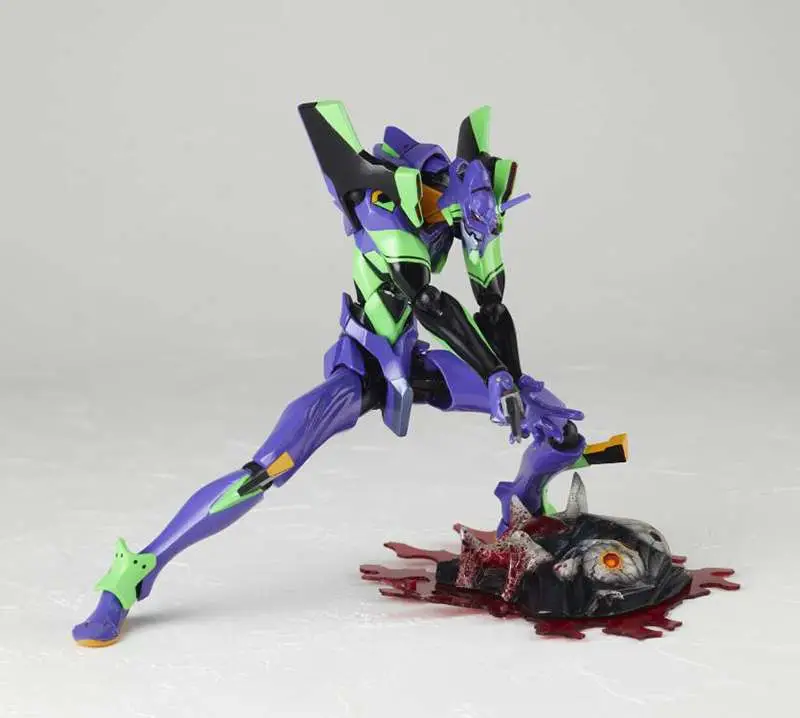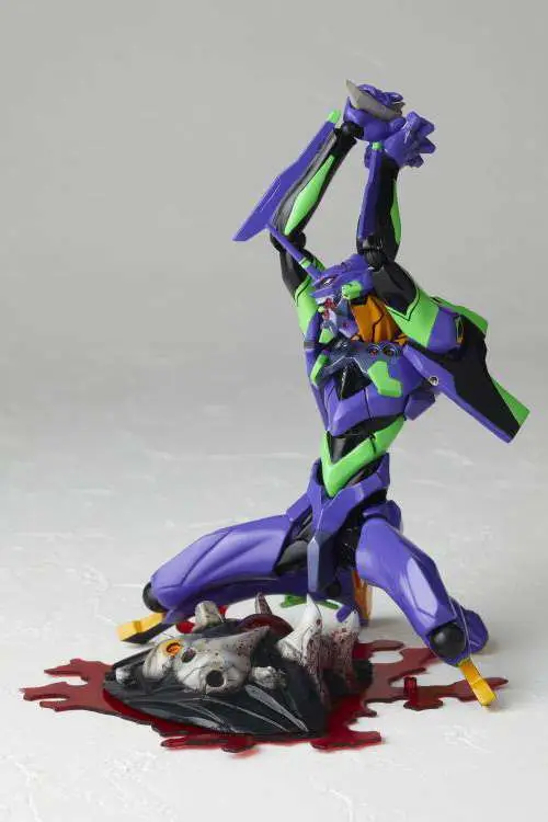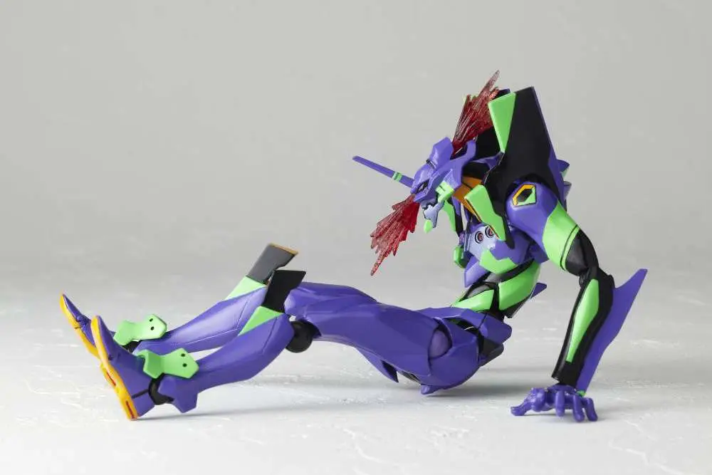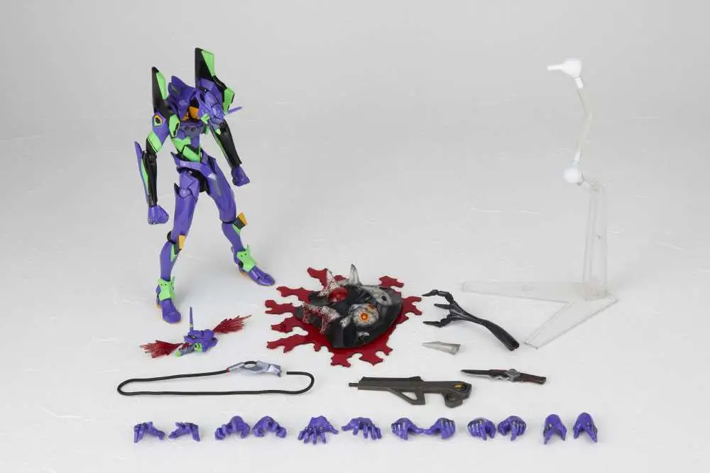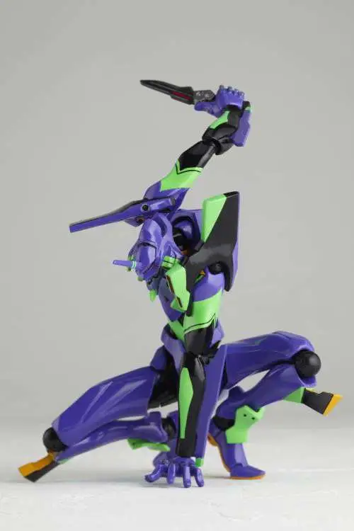 From the Rebuild of Evangelion film series, the EVA Unit-01 is back in the Evangelion Evolution series by Kaiyodo. This figure stands 5.50 inches tall and features 22 points of articulation. EVA-01 includes a 4th Angel display base, several interchangeable parts and accessories, and features special glow in the dark paint.