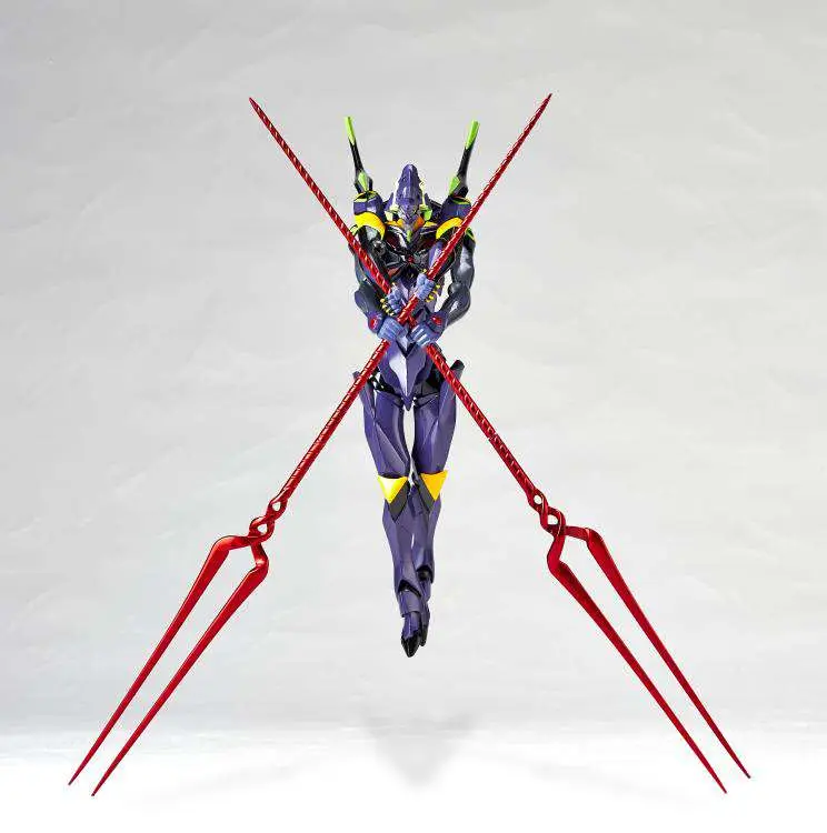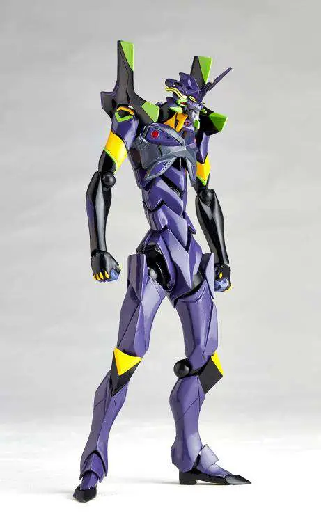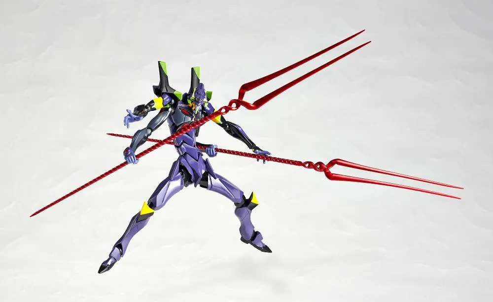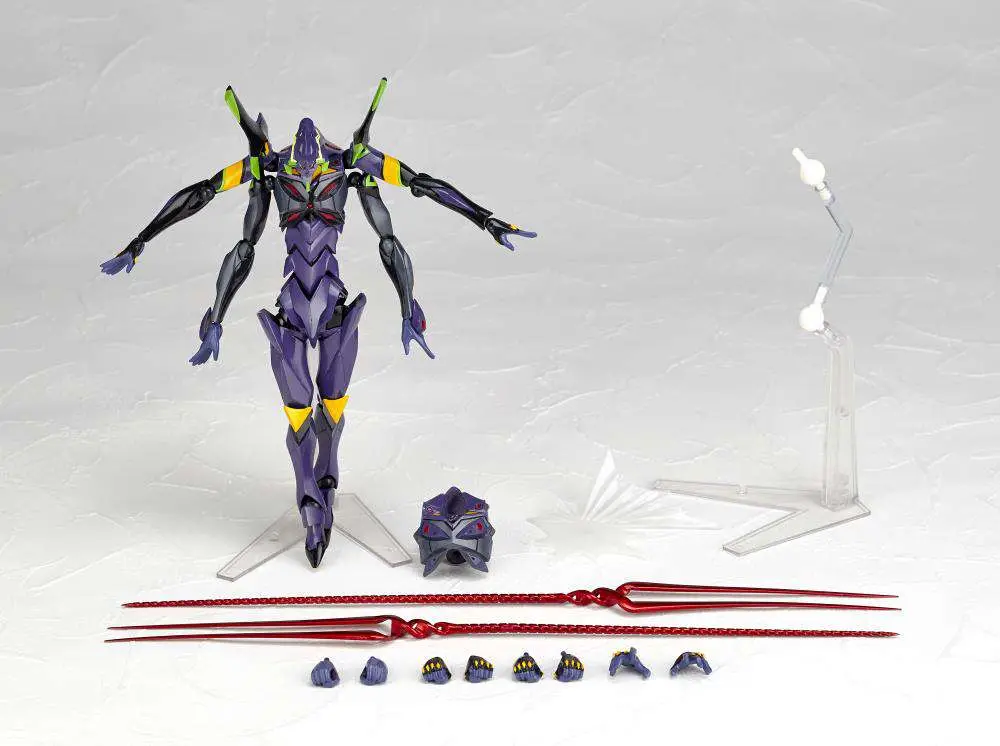 Kaiyodo's Revoltech Evangelion Evolution EVA-13 is back! Its body is super-flexible and loaded with joints for amazing posability; you can display it in its four-armed or two-armed state with its interchangeable torsos, and it's also armed with two spears; eight interchangeable hands are also provided, as is a rifle, an AT field and a missile to emerge from it, plus a stand with a flexible posing arm and a support rod for the AT field.