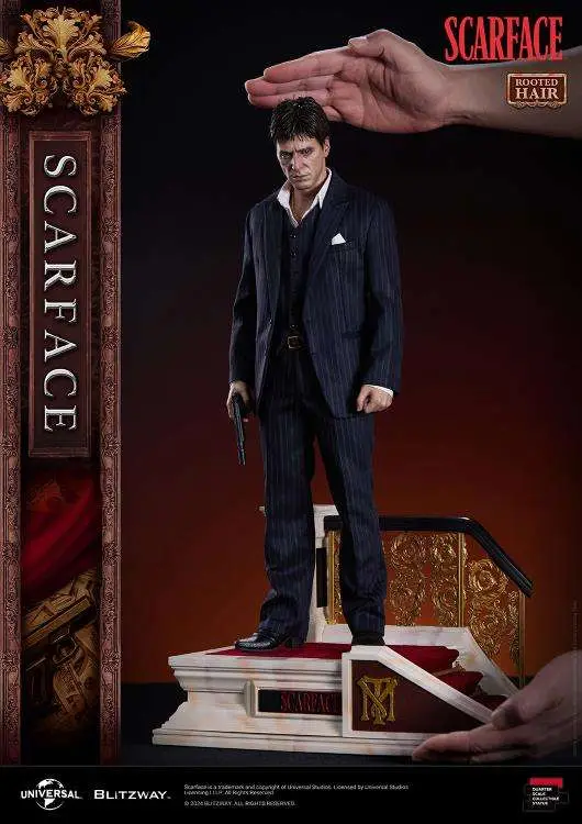 With lavish golden railings, plush red carpet stairs, and Tony Montana's poised figure, Blitzway’s "Scarface" captures the nuanced moments of contrast in his expressions. Available in both Standard and Rooted Hair Versions.