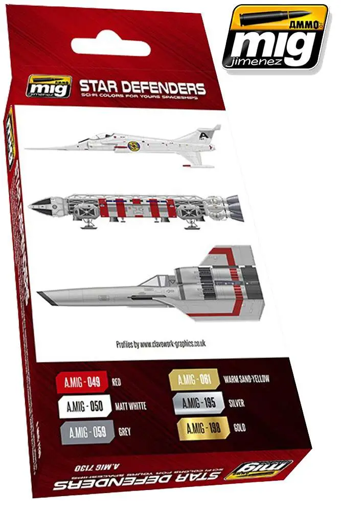 This set includes a selection of some of the most common colors used for spacecraft and vehicles. This set is focused on ships featured in films such as Space 1999, Battlestar Galactica and others . Each jar includes a stainless steel agitator to facilitate mixture. Contains 6 bottles of 17 ml.