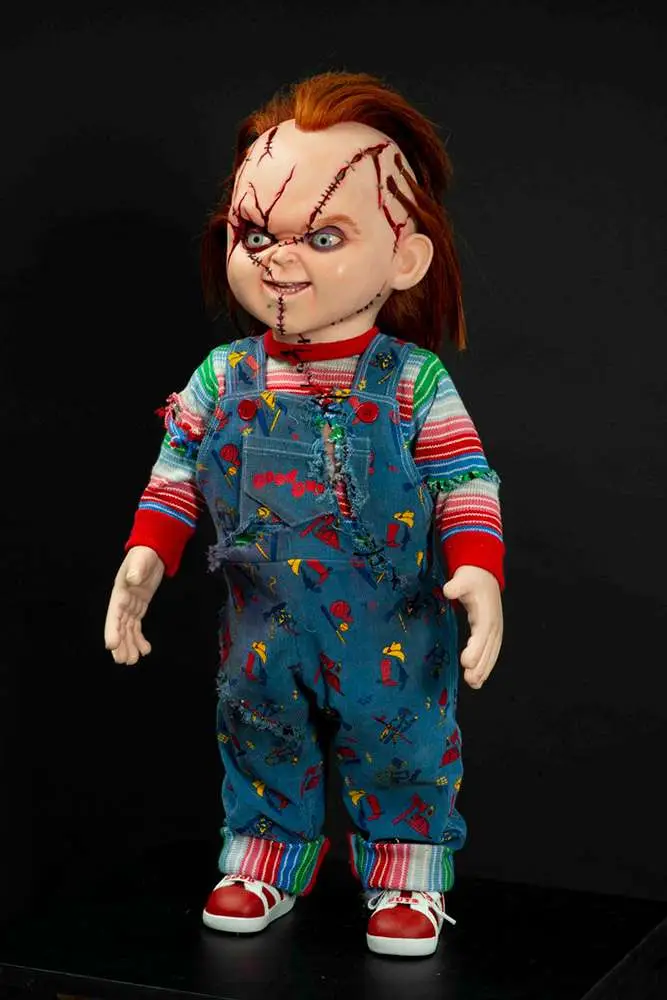 The production molds for the Doll where made from the actual screen used Seed of Chucky Doll Master Molds and the Paint Master was made directly from the insane hands of Tony Gardner, making this the most screen accurate Scarred Chucky Doll ever produced and made available to the public. The Doll stand 30" tall. People will swear that you're holding the actual Screen Used Doll in your evil hands. The internal frame of the doll is made from POM (Polyoxymethylene) Thermoplastic Connectors surrounded by a soft flexible foam giving you the ultimate in durability and flexibility allowing you to pose the Doll anyway you want.