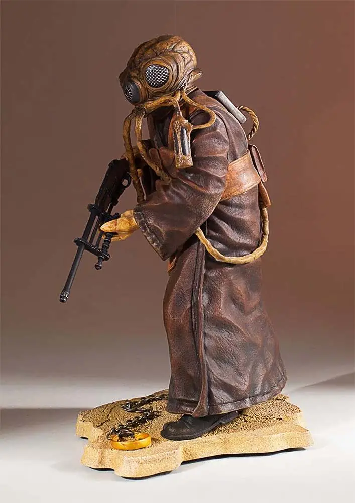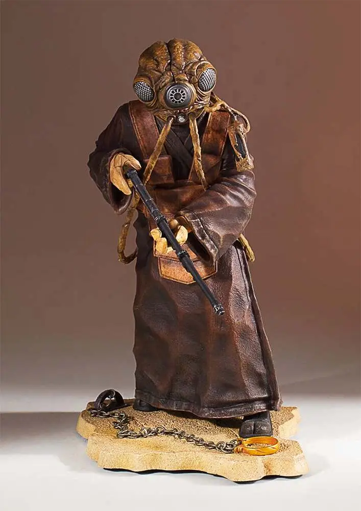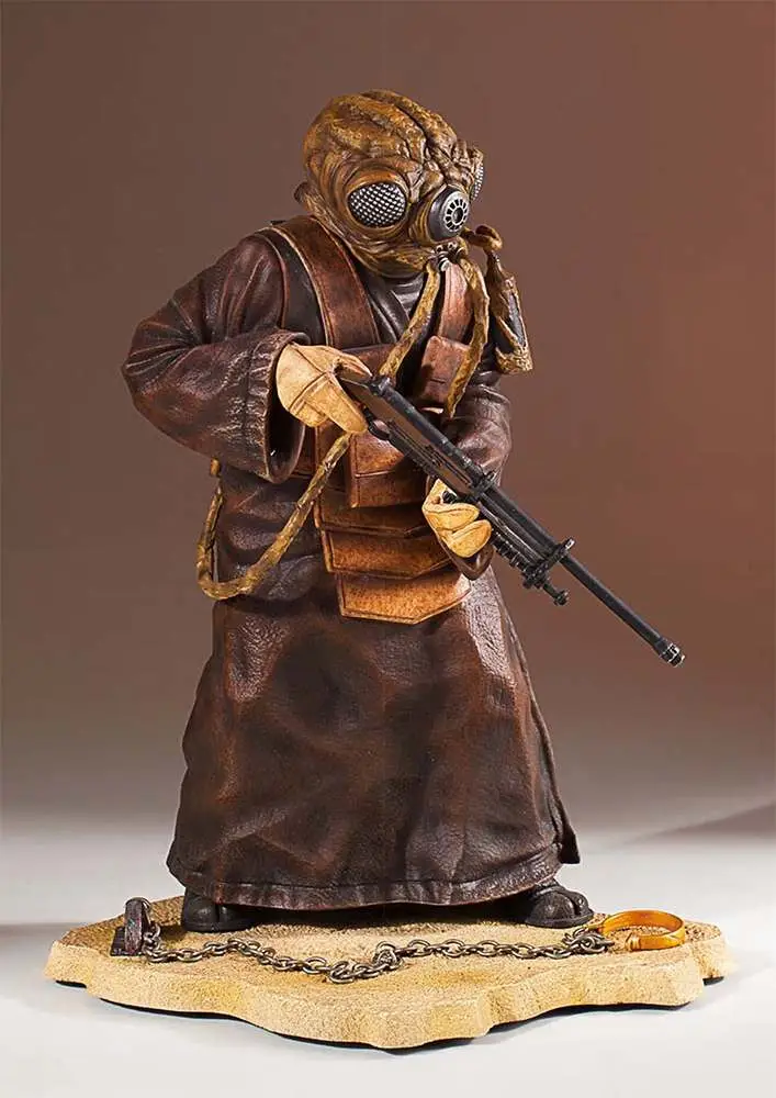 The artists in Gentle Giant take you on a journey to see the moments just following the events of the death of Jabba, we find Zuckuss on Tattoine, at his feet, a chain left by Jabba’s escaped prize. Zuckuss is still on the hunt, reading the clues, catching the trail with his GRS-1 Snare Rifle in hand.