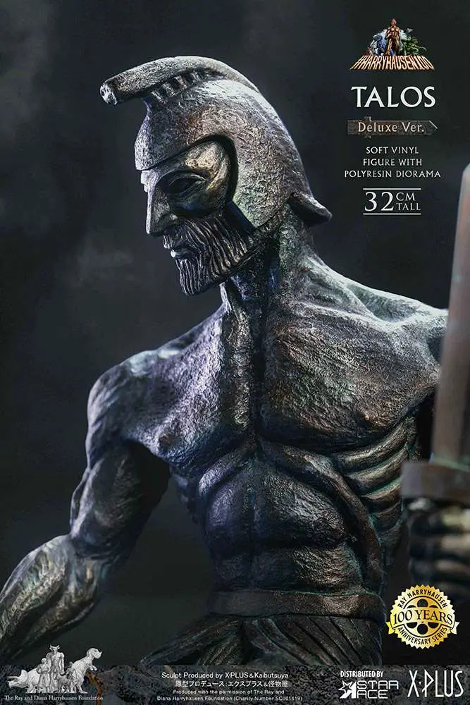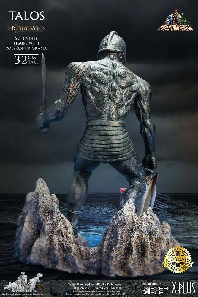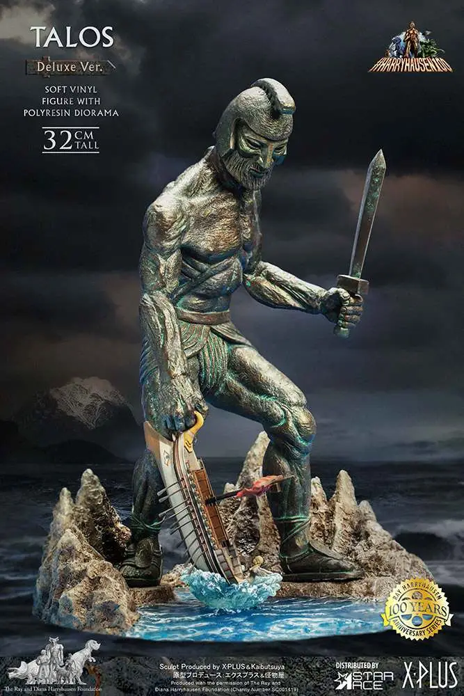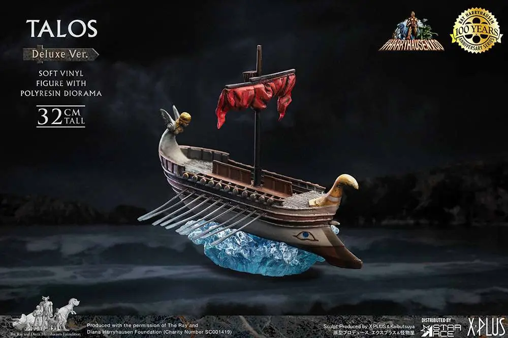 Traditionally sculpted by the artisans of the famed creature shop of Kaibutsuya, this detailed Talos statue is made from soft vinyl and stands 32cm tall. Each piece is hand-painted to look like it has an ancient Bronze finish. He is posed with his sword in one hand and bending over to pull the ship out of the water, the boat is supported by a sculpted water splash.