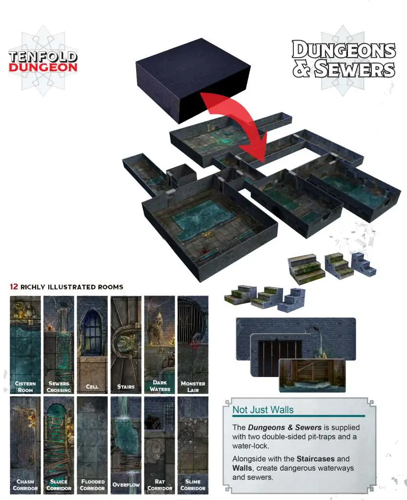 Tenfold Dungeon est la solution pour un terrain de table compact et abordable à utiliser avec n'importe quel jeu de plateau, RPG et wargame de type "dungeon-crawling", le tout fabriqué à partir de la boîte dans laquelle il se trouve.