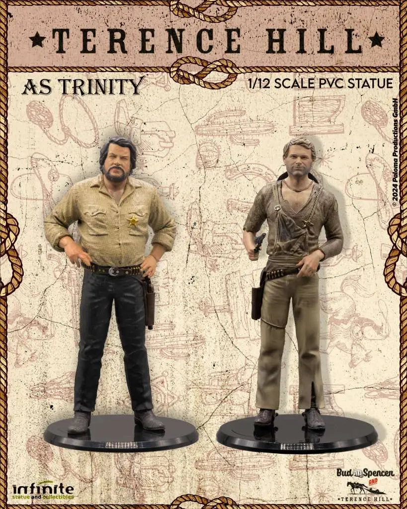 Following the great success of the 1/6 scale resin statues, the Infinite Statue & Collectibles teams are excited to introduce new collection of 1/12 scale PVC mini statues dedicated to the legendary Bud Spencer and Terence Hill! Portrayed in their iconic roles as Bambino, Banana Joe, Bulldozer, and Trinità, these characters charm and entertain in an even more compact version. Each miniature, rich in detail and character, is perfect for collectors and movie lovers alike. Don’t miss the chance to bring home a piece of the historic friendship that has made generations laugh!