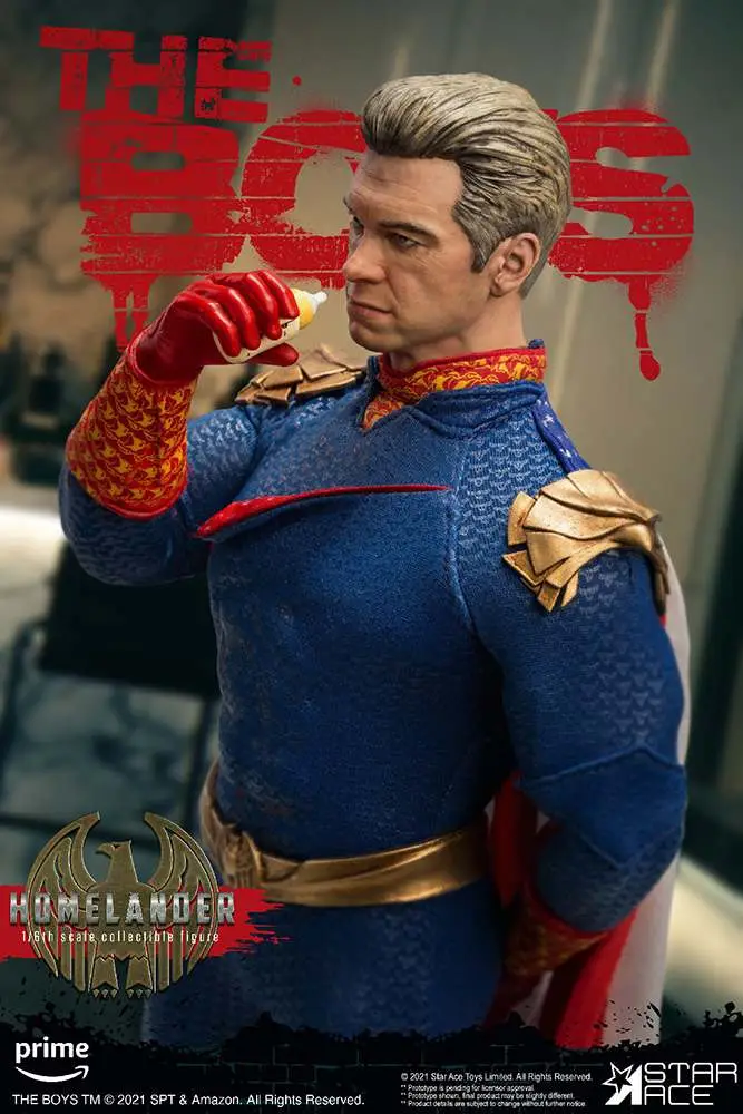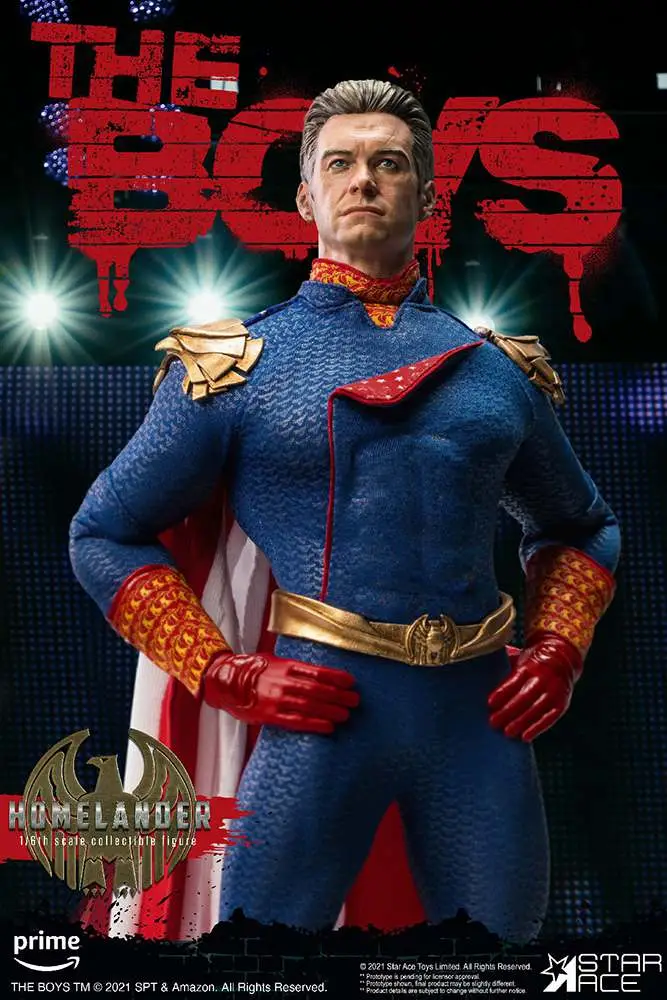 This 1/6th scale figure of Homelander features a specially designed custom Seamless body developed with TBLeague that is fully articulated and has over 30 points of articulation. The authentic headsculpts include the exacting likeness of Antony Starr as Homelander and were sculpted by renowned figure artist Vimal Kerketta. The serious expression of Homelander features a light up function to simulate the death beams.