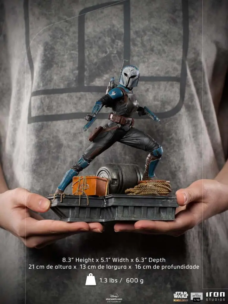 Iron Studios' line of statues from The Mandalorian series, featuring Mando and Grogu (Baby Yoda) Art Scale 1/10, and The Mandalorian BDS Art Scale 1/10 and Moff Gideon Art Scale 1/10 composing a battle diorama scene (both already available for Pre-Order - sold separately), adds one more to the incredible line, the "Bo-Katan BDS Art Scale 1/10 - The Mandalorian - Iron Studios" statue. Inspired by her first appearance in the live-action, in a defensive position and ready for action, she wields her blaster pistols over a diorama base filled with elements such as ropes, a box, and a barrel, which allude to the vessel's deck in the waters of Trask, where she flies in with her jetpack and lands to save Din Djarin. Faithfully portraying her armor, the figure presents the warrior with her helmet, preserving the mysterious Mandalorian aura... This is the way!