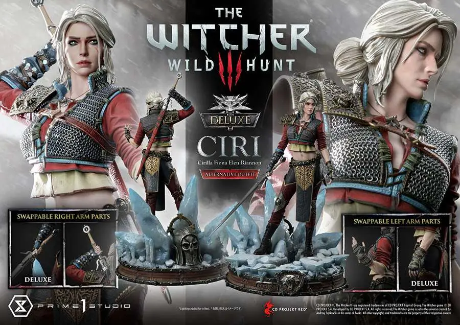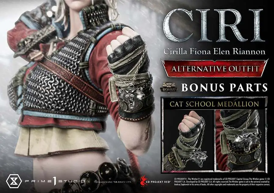 The Deluxe Bonus Version comes with two (2) sets of Swappable Arms to extend your storytelling. Her right arm can either be drawing her trusty sword, Zireael, or already holding it out. And her left arm is ready to block up or down! Moreover, if you order from Prime 1 Studio’s online store and authorized dealer, Ciri will come with a fifth swappable arm: it features her left hand clutching the iconic Cat School Medallion she lifted from the corpse of Leo Bonhart!