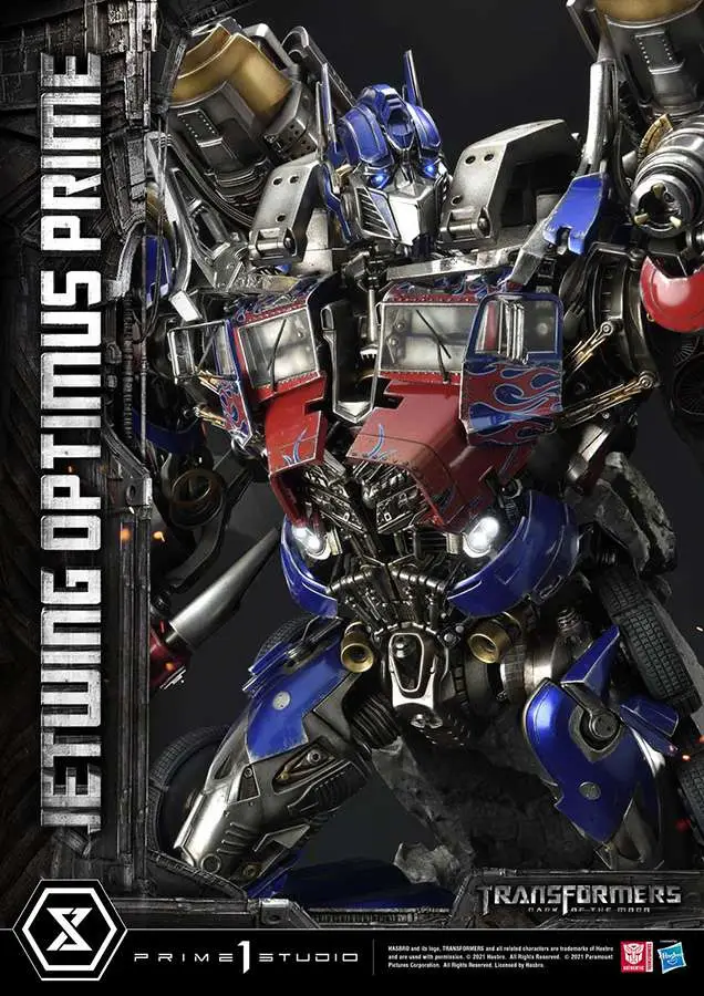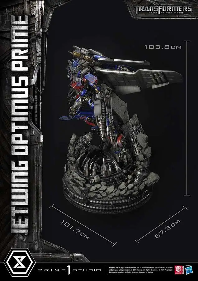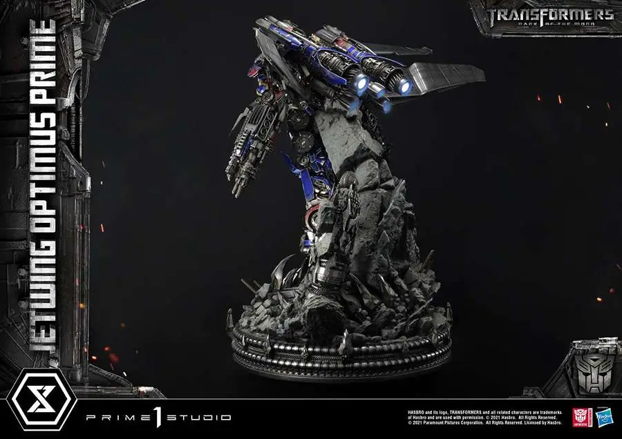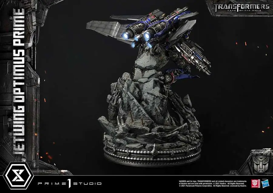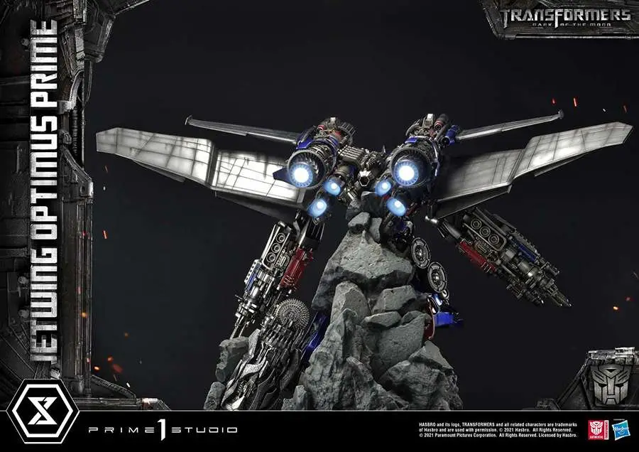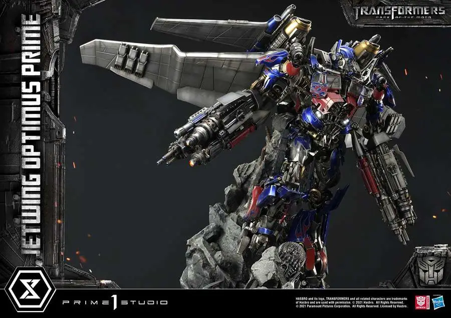 Swooping in at 41 inches tall, perhaps the only thing better than Optimus Prime is a flying Optimus Prime with twin guns blazing! In Transformers: Dark of the Moon’s epic final action sequence, Optimus Prime outfits himself with his Jetwing flight gear and literally fights all of the Decepticons! Who of us did not have chills and goosebumps when Optimus finally took down The Driller? Well, Prime 1 Studio interprets that unbelievable scene in our astonishing statue.