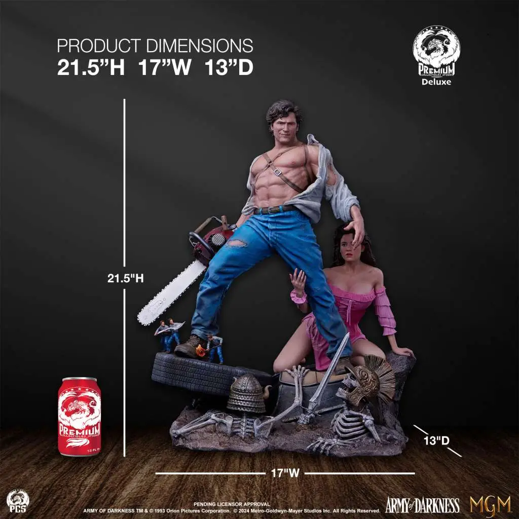 Alta oltre 21 pollici e larga 17, questa statua in scala 1:4 ricrea l'iconico poster del film, raffigurante Ash che si erge trionfante in cima ai resti della sua fidata vecchia auto, con la camicia strappata e un sorriso sornione sul volto.