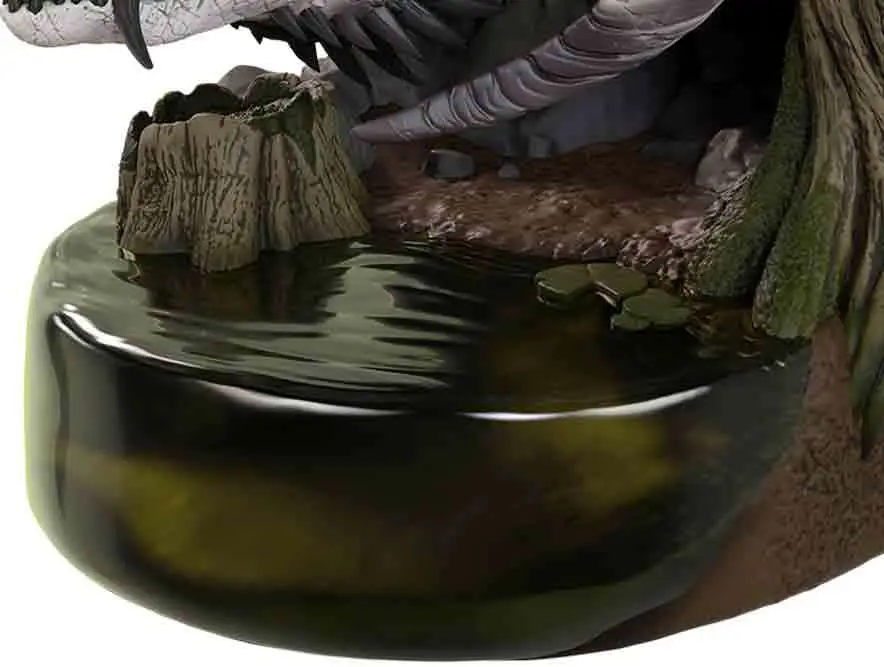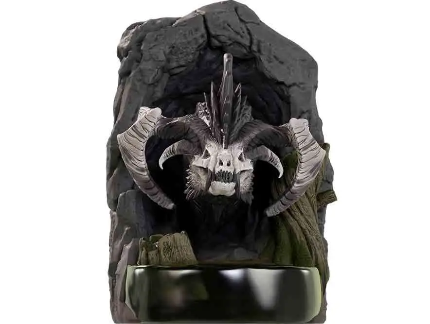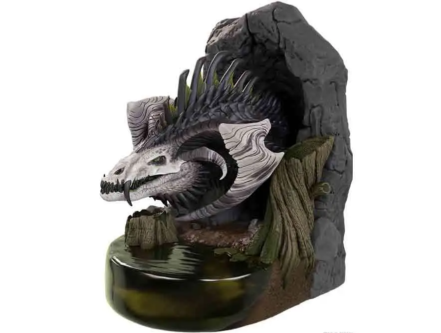 Questo fermalibri in resina alto 17,5 cm raffigura il Drago Nero dell'ultimo Manuale dei Mostri nel suo habitat preferito, una fetida palude.