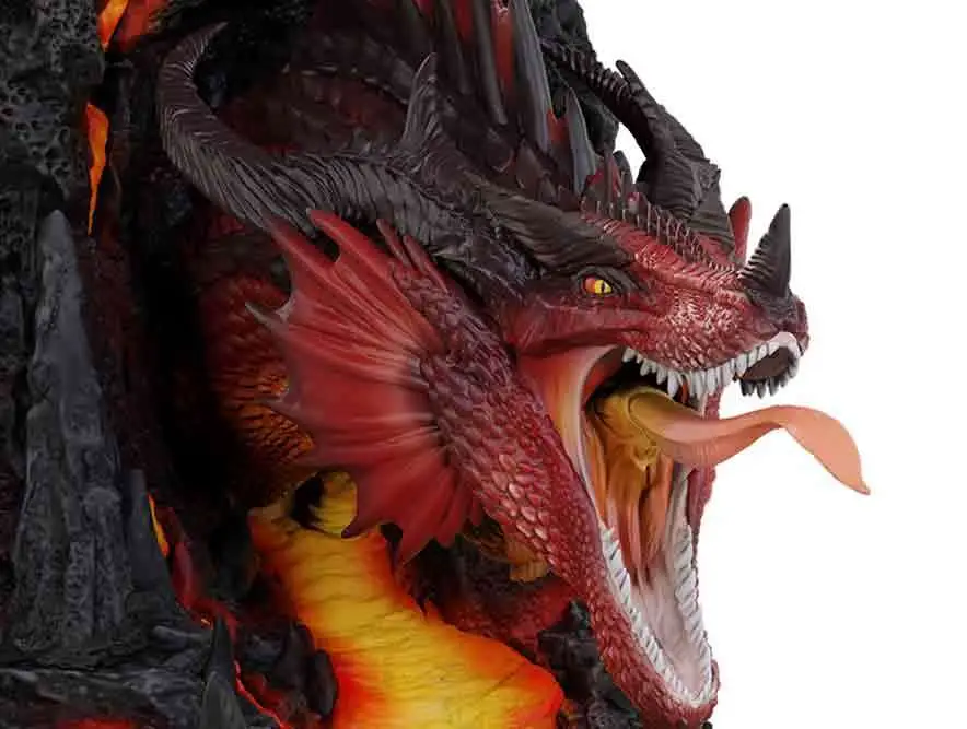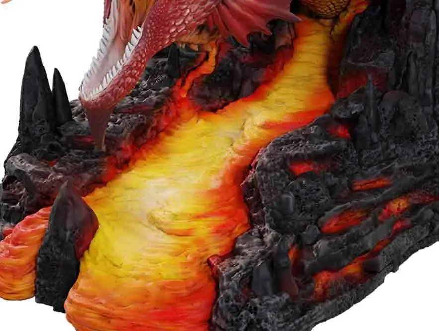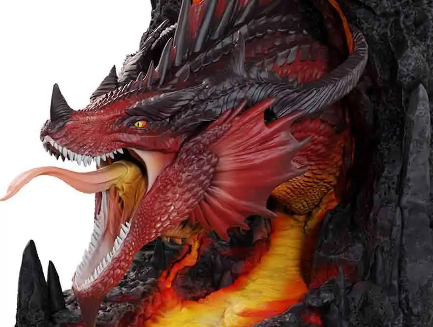 Questo fermalibri in resina alto 17,5 cm raffigura il Drago Rosso dell'ultimo Manuale dei Mostri nel suo habitat preferito, una caverna vulcanica.