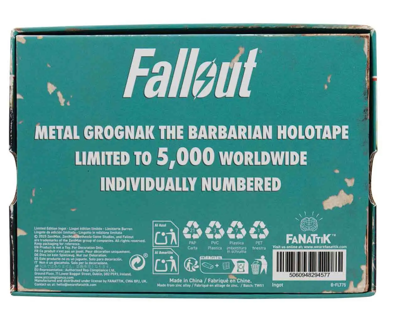 Limitato a 5.000 pezzi in tutto il mondo, ogni Holotape è numerato singolarmente, rendendo il tuo un pezzo unico! Con dimensioni di 85 x 70 mm, questa pesante reliquia da collezione è fornita con un supporto incluso nella confezione, perfetto per esibire i tuoi trionfi di Grognak.