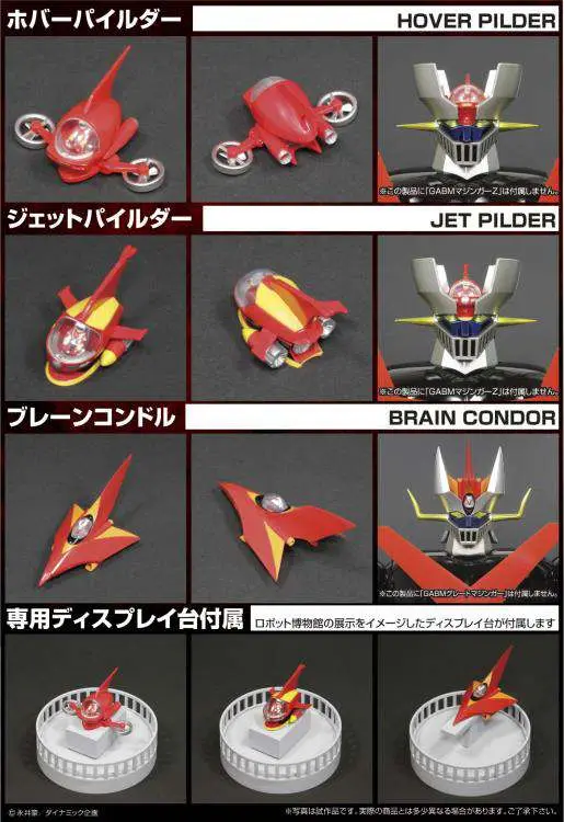 In questo set trovate le riproduzioni delle 3 classiche navette usate dai piloti dei celebri robot creati da Go Nagai. Le repliche sono in metallo e misurano dai 4 ai 7.5 cm