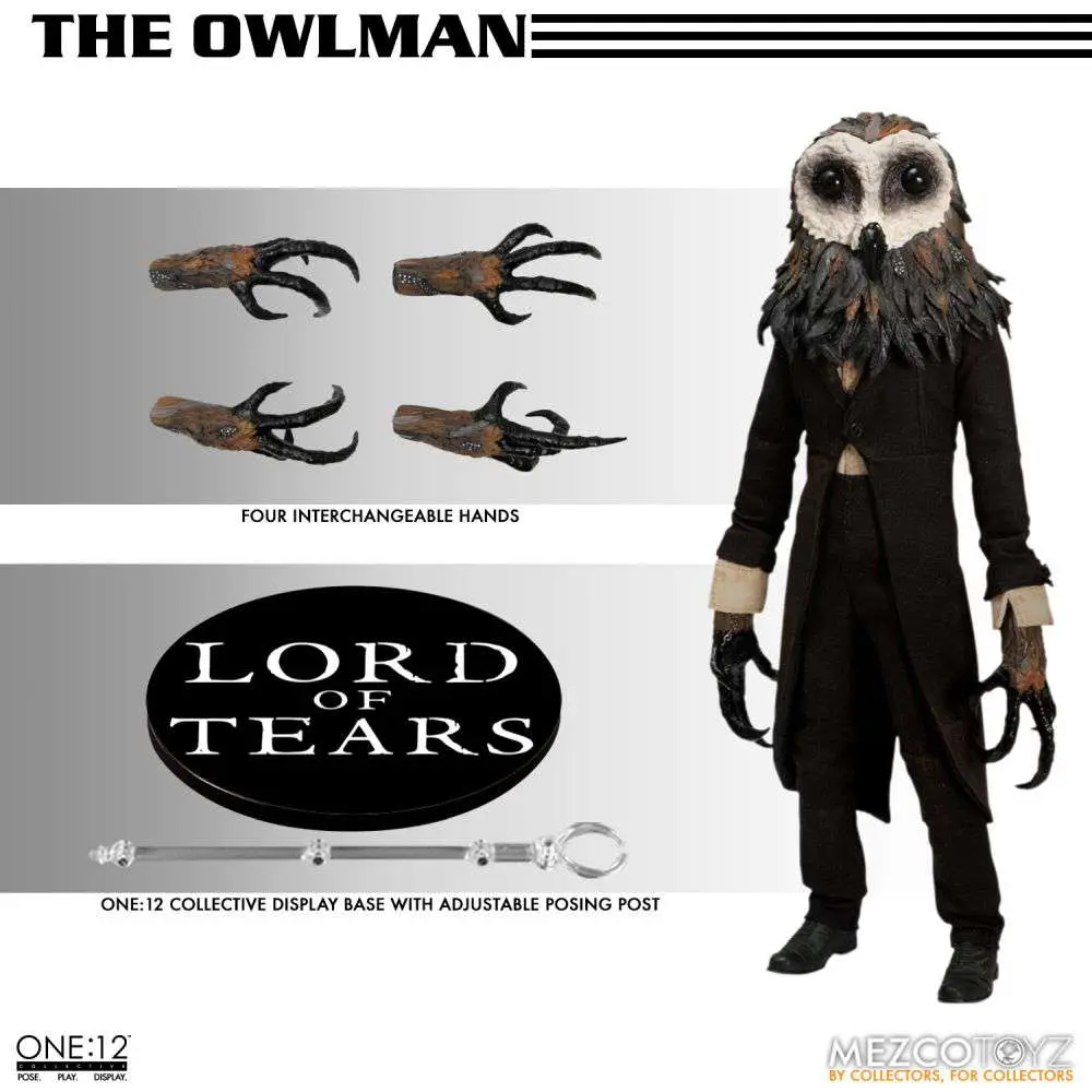 Nuova uscita per la serie One: 12 Collective di Mezco Toys: da "Lord of Tears" ecco The Owlman! La figura indossa un dettagliato abito in vera stoffa ed è dotata di articolazioni e accessori: mani intercambiabili, stand display con logo, chiavi, teschio, testa decapitata, parti per gli effetti e altro ancora!
