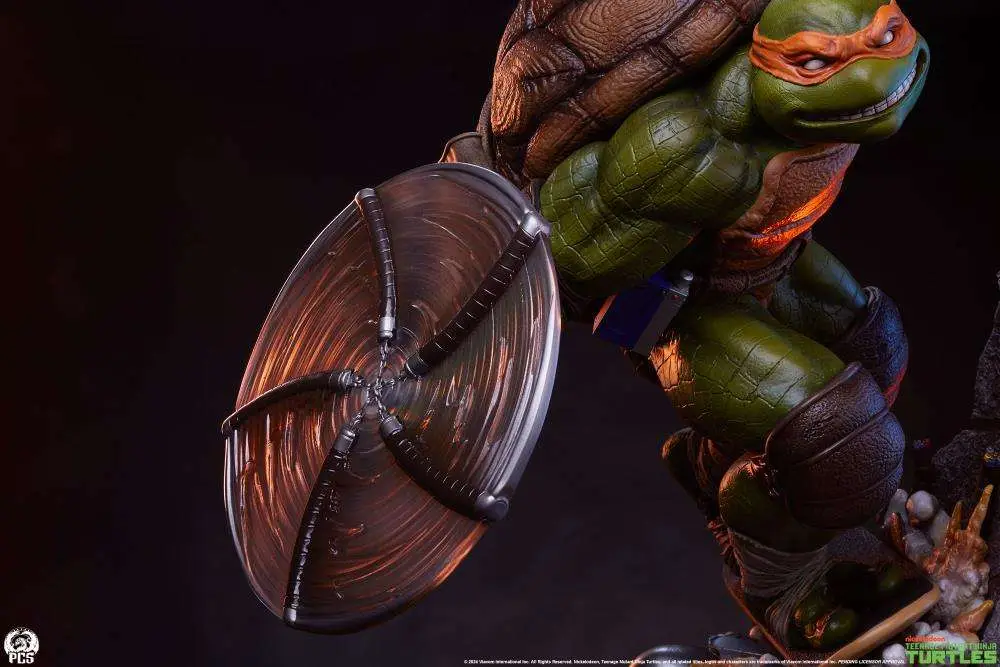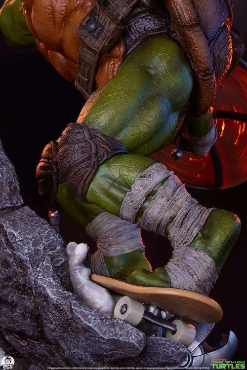 Questa statua scolpisce dettagliatamente anche i particolari come le protezioni sulle ginocchia e sui gomiti, le fasce di stoffa intorno alle mani e ai piedi nonché la cintura di pelle con una tonnellata di sacchetti per contenere i tipici accessori ninja... o più probabilmente, gli spuntini. L'ampio sorriso sul volto e la maschera arancione che svolazza nella brezza esaltano il senso di movimento e divertimento che rende Michelangelo il preferito dei fan.